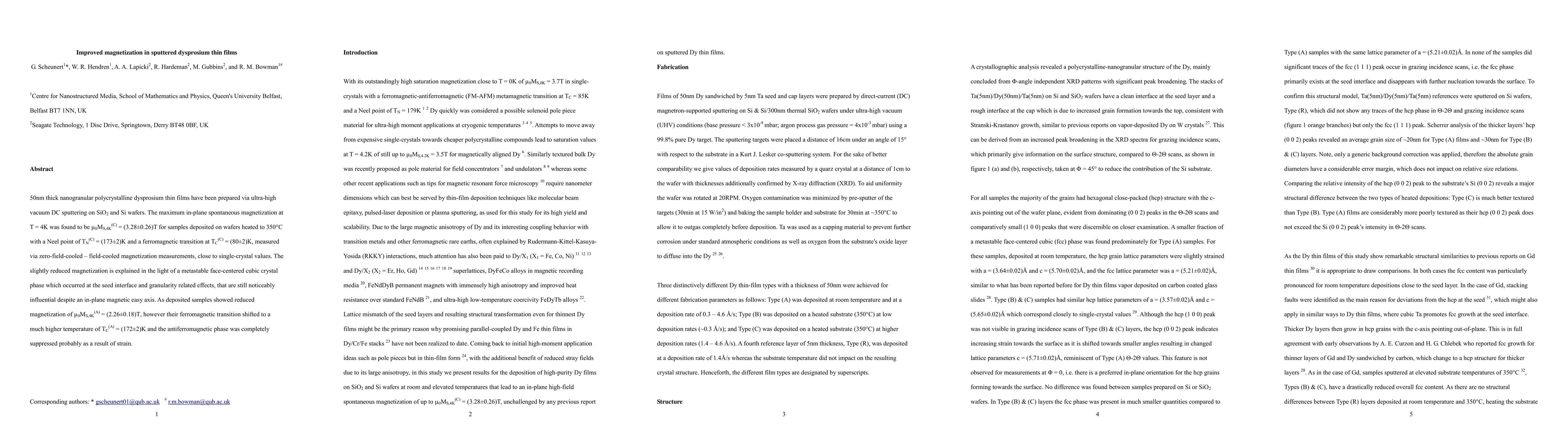 Thin films of dysprosium prepared via sputtering show improved magnetization with a maximum in-plane spontaneous magnetization of 3.28T at 4K, approaching single crystal values. The high temperature ferromagnetic transition is influenced by strain and granularity effects.