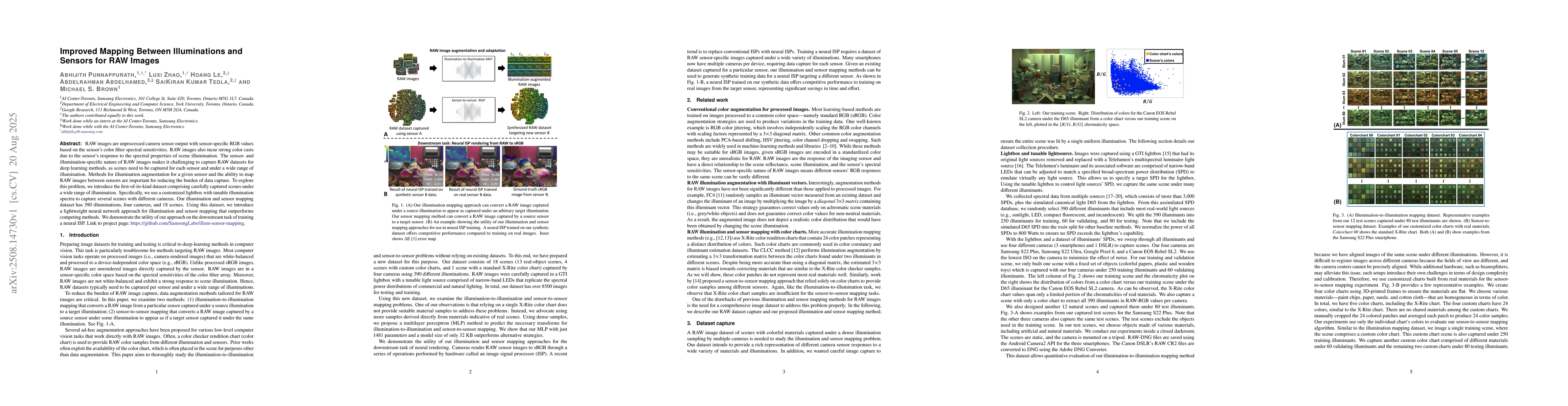 The paper introduces a dataset of RAW images captured under various illuminations and with different sensors, alongside a lightweight neural network approach for mapping between illuminations and sensors, which outperforms competing methods.