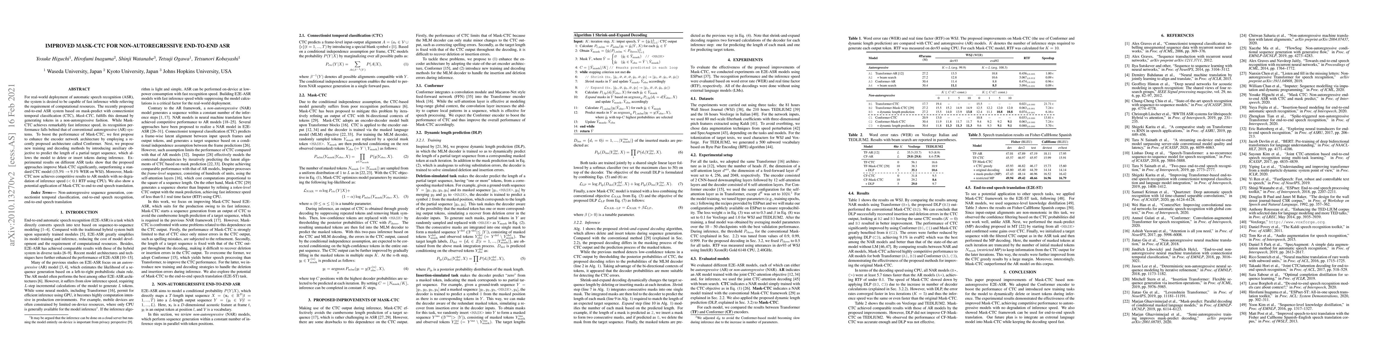 This paper proposes enhancements to the Mask-CTC model for faster, non-autoregressive end-to-end ASR, achieving improved recognition performance comparable to autoregressive models while maintaining fast inference speeds. The improvements include Conformer architecture and new training/decoding methods, resulting in significant reductions in Word Error Rate (WER) on ASR tasks.