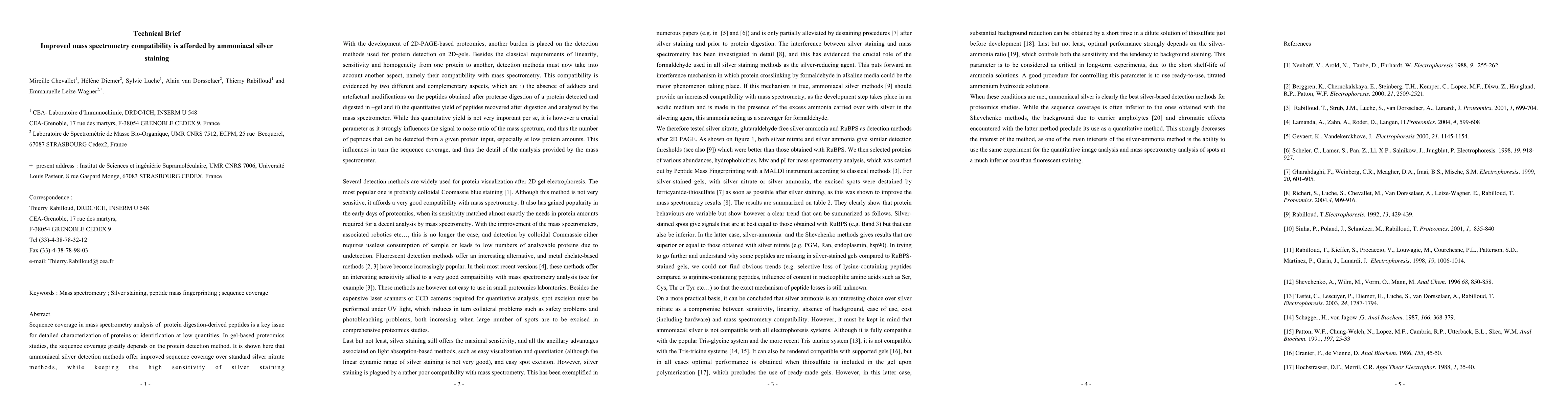 Sequence coverage in MS analysis of protein digestion-derived peptides is a key issue for detailed characterization of proteins or identification at low quantities. In gel-based proteomics studies, the sequence coverage greatly depends on the protein detection method. It is shown here that ammoniacal silver detection methods offer improved sequence coverage over standard silver nitrate methods, while keeping the high sensitivity of silver staining. With the development of 2D-PAGE-based proteomics, another burden is placed on the detection methods used for protein detection on 2-D-gels. Besides the classical requirements of linearity, sensitivity, and homogeneity from one protein to another, detection methods must now take into account another aspect, namely their compatibility with MS. This compatibility is evidenced by two different and complementary aspects, which are (i) the absence of adducts and artefactual modifications on the peptides obtained after protease digestion of a protein detected and digested in - gel, and (ii) the quantitative yield of peptides recovered after digestion and analyzed by the mass spectrometer. While this quantitative yield is not very important per se, it is however a crucial parameter as it strongly influences the S/N of the mass spectrum and thus the number of peptides that can be detected from a given protein input, especially at low protein amounts. This influences in turn the sequence coverage and thus the detail of the analysis provided by the mass spectrometer.