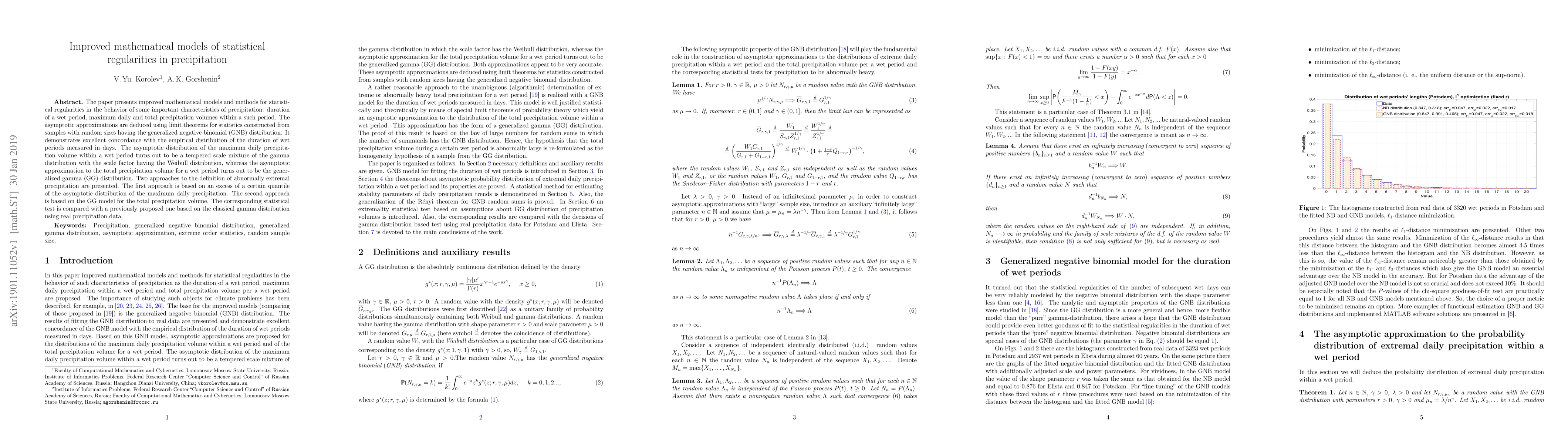 The paper presents improved mathematical models and methods for statistical regularities in the behavior of some important characteristics of precipitation: duration of a wet period, maximum daily and total precipitation volumes within a such period. The asymptotic approximations are deduced using limit theorems for statistics constructed from samples with random sizes having the generalized negative binomial (GNB) distribution. It demonstrates excellent concordance with the empirical distribution of the duration of wet periods measured in days. The asymptotic distribution of the maximum daily precipitation volume within a wet period turns out to be a tempered scale mixture of the gamma distribution with the scale factor having the Weibull distribution, whereas the asymptotic approximation to the total precipitation volume for a wet period turns out to be the generalized gamma (GG) distribution. Two approaches to the definition of abnormally extremal precipitation are presented. The first approach is based on an excess of a certain quantile of the asymptotic distribution of the maximum daily precipitation. The second approach is based on the GG model for the total precipitation volume. The corresponding statistical test is compared with a previously proposed one based on tha classical gamma distribution using real precipitation data.