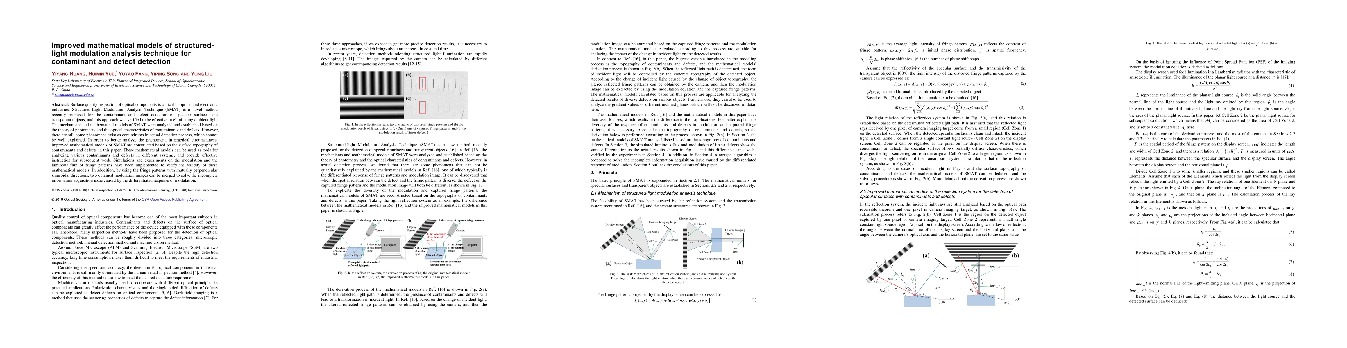 This paper proposes improved mathematical models for the Structured-Light Modulation Analysis Technique (SMAT) to enhance contaminant and defect detection in optical components. These models address practical phenomena not explained by previous models, validated through simulations and experiments on fringe patterns.