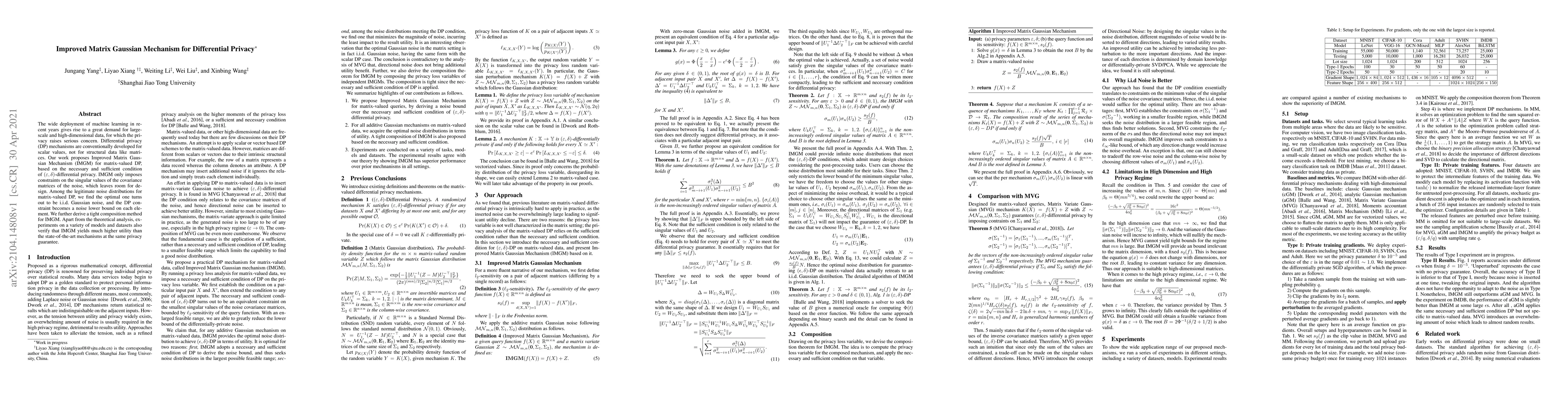 This paper proposes the Improved Matrix Gaussian Mechanism (IMGM) for differential privacy in high-dimensional data, optimizing for matrix-valued privacy based on Gaussian noise. The method achieves higher utility compared to existing mechanisms while maintaining the same privacy guarantees.
