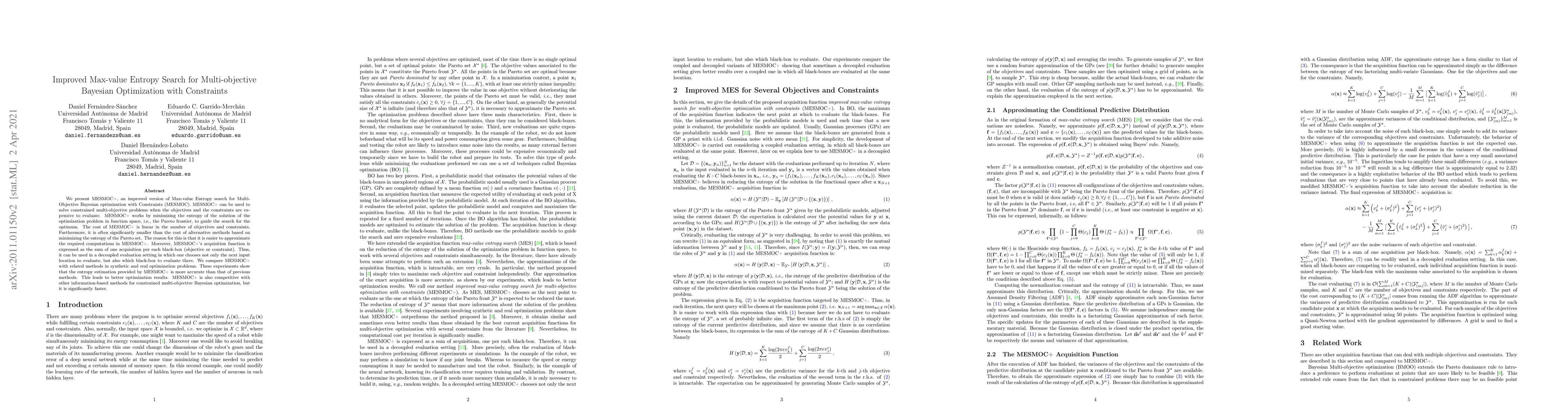 MESMOC+ enhances Max-value Entropy Search for solving constrained multi-objective Bayesian optimization problems efficiently. It offers a faster and more accurate entropy estimation compared to previous methods, leading to superior optimization results.