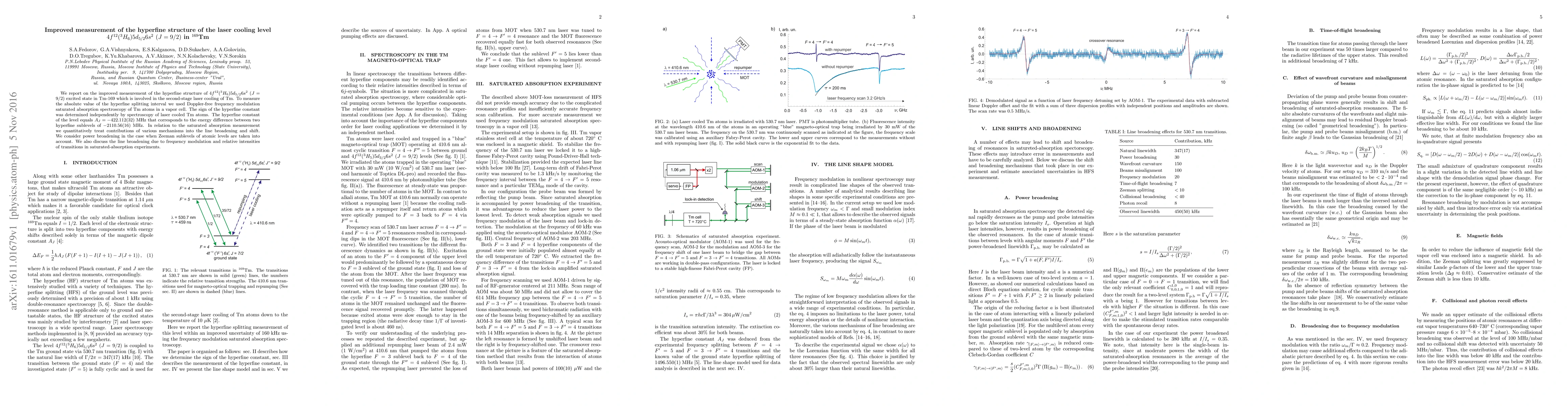 The paper presents an improved measurement of the hyperfine structure of a specific laser cooling level in Tm-169 using Doppler-free frequency modulation saturated absorption spectroscopy. The hyperfine constant was determined as -422.112(32) MHz, with contributions from various broadening mechanisms quantitatively treated and discussed.