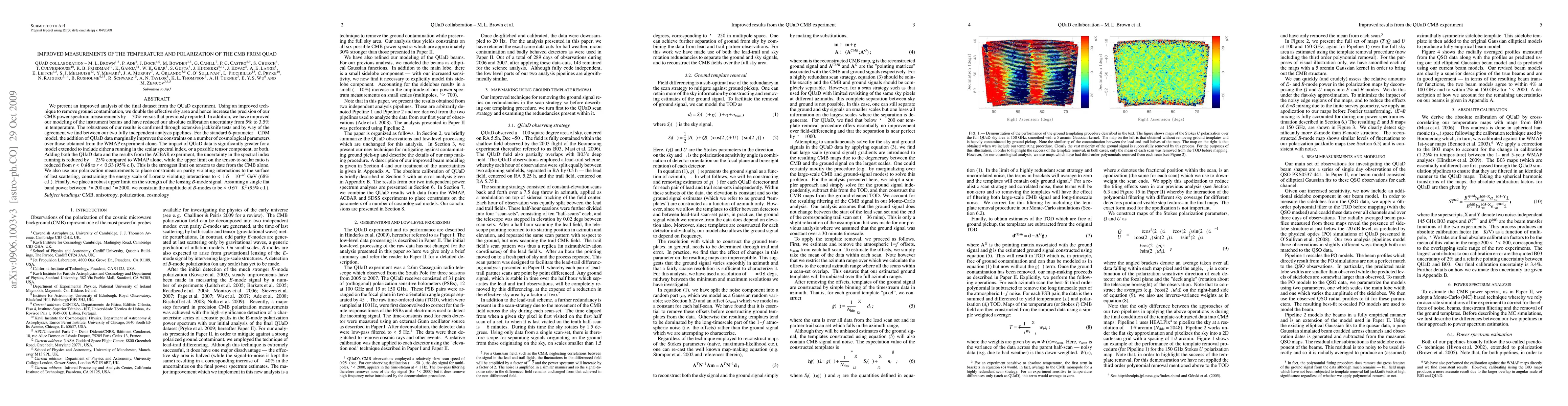 The QUaD experiment's improved analysis enhances CMB temperature and polarization measurements, doubling the effective sky area and improving precision by ~30%. The study also significantly reduces calibration uncertainty and constrains cosmological parameters, particularly benefiting models with scalar spectral index running or tensor components.