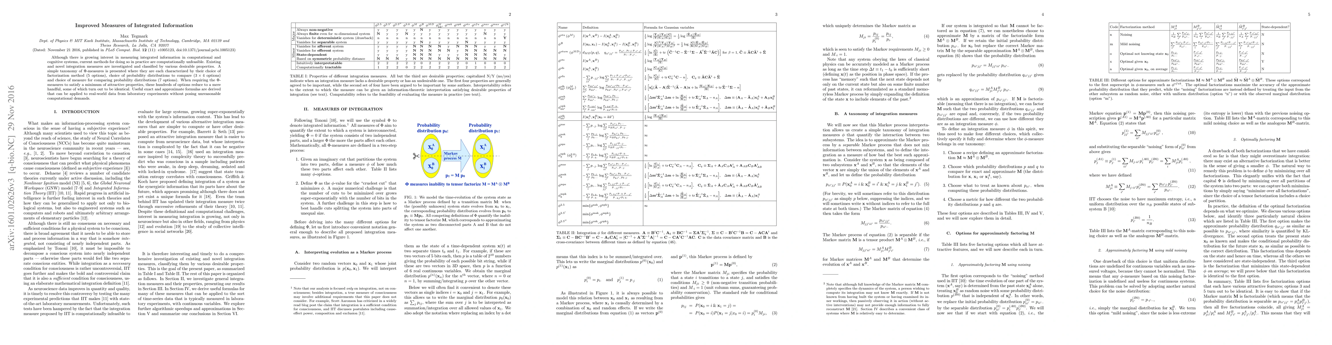 Although there is growing interest in measuring integrated information in computational and cognitive systems, current methods for doing so in practice are computationally unfeasible. Existing and novel integration measures are investigated and classified by various desirable properties. A simple taxonomy of Phi-measures is presented where they are each characterized by their choice of factorization method (5 options), choice of probability distributions to compare (3x4 options) and choice of measure for comparing probability distributions (7 options). When requiring the Phi-measures to satisfy a minimum of attractive properties, these hundreds of options reduce to a mere handful, some of which turn out to be identical. Useful exact and approximate formulas are derived that can be applied to real-world data from laboratory experiments without posing unreasonable computational demands.
