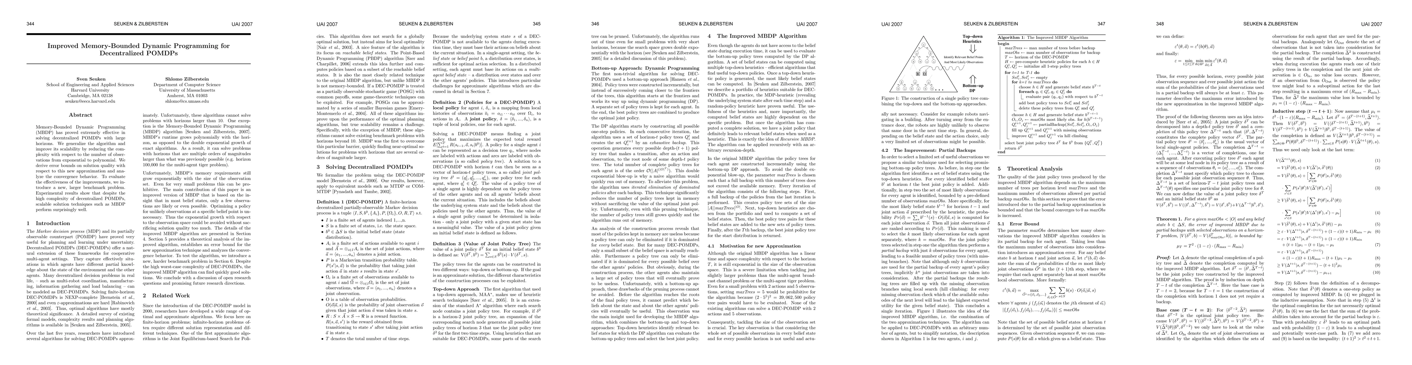 This paper improves Memory-Bounded Dynamic Programming for solving decentralized POMDPs, reducing complexity from exponential to polynomial and providing error bounds. Experimental results demonstrate the effectiveness of the scalable solution technique on a new, larger benchmark problem.