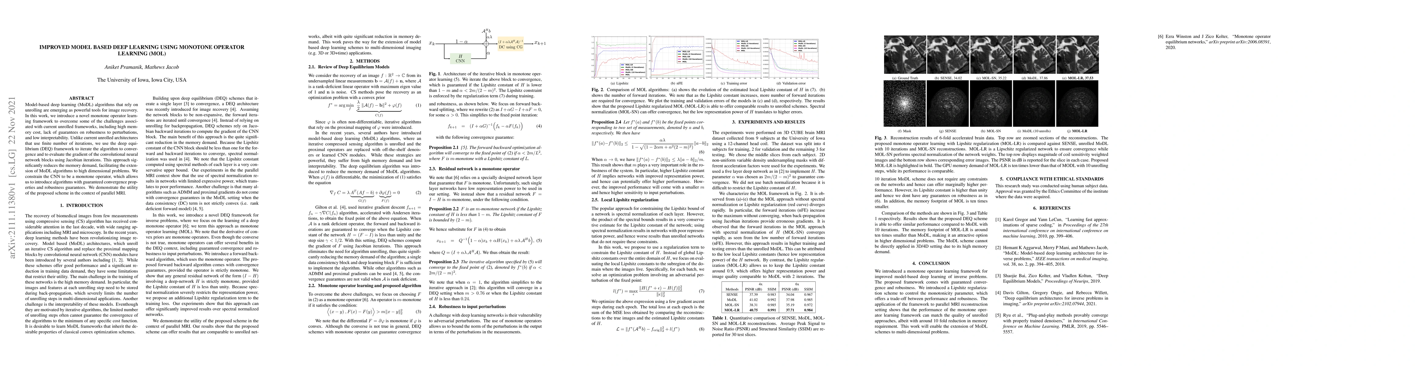 Model-based deep learning (MoDL) algorithms that rely on unrolling are emerging as powerful tools for image recovery. In this work, we introduce a novel monotone operator learning framework to overcome some of the challenges associated with current unrolled frameworks, including high memory cost, lack of guarantees on robustness to perturbations, and low interpretability. Unlike current unrolled architectures that use finite number of iterations, we use the deep equilibrium (DEQ) framework to iterate the algorithm to convergence and to evaluate the gradient of the convolutional neural network blocks using Jacobian iterations. This approach significantly reduces the memory demand, facilitating the extension of MoDL algorithms to high dimensional problems. We constrain the CNN to be a monotone operator, which allows us to introduce algorithms with guaranteed convergence properties and robustness guarantees. We demonstrate the utility of the proposed scheme in the context of parallel MRI.