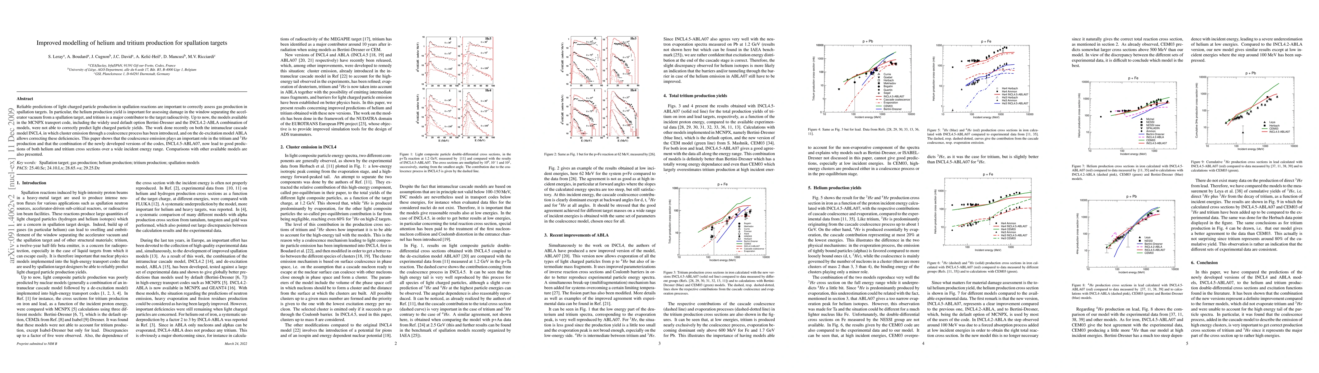 This paper presents improved modelling of helium and tritium production in spallation targets using updated versions of the INCL4 and ABLA models, showing that coalescence emission significantly enhances predictions of these light charged particle yields. The new INCL4.5-ABLA07 combination provides accurate predictions of both helium and tritium cross sections over a broad energy range.