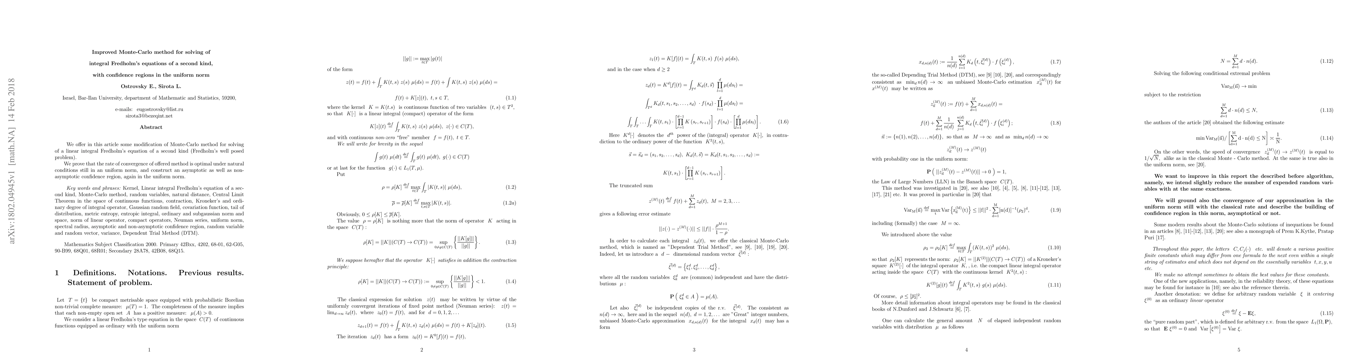 This paper proposes a modified Monte-Carlo method for solving linear integral Fredholm's equations of the second kind, demonstrating optimal convergence rates under natural conditions and constructing both asymptotic and non-asymptotic confidence regions in the uniform norm.