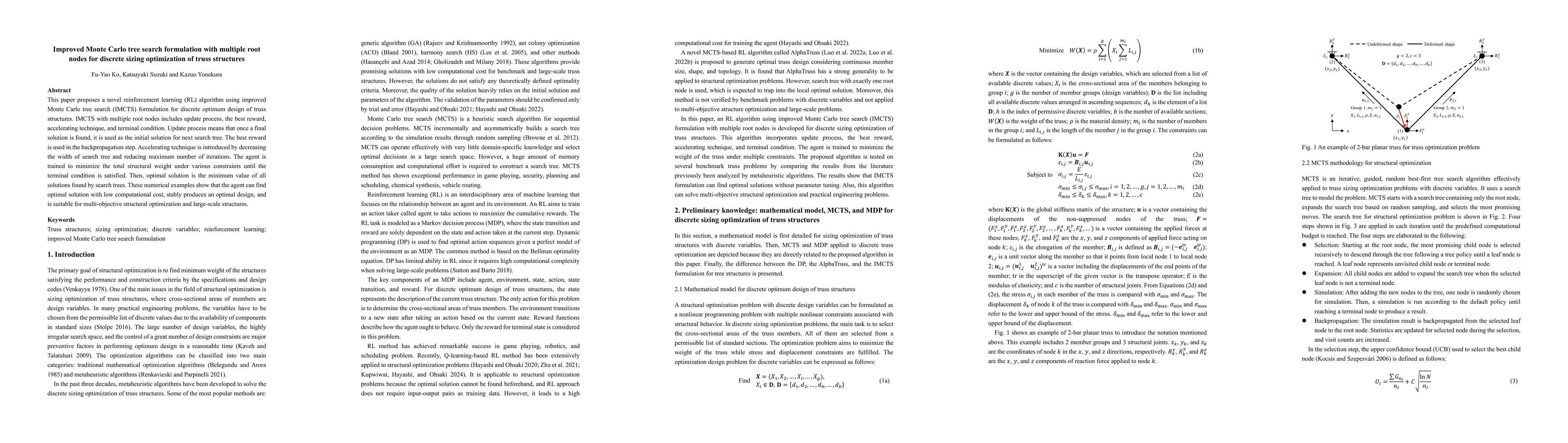 This paper introduces an enhanced Monte Carlo tree search (MCTS) method with multiple root nodes for optimizing the discrete sizing of truss structures. The proposed approach incorporates an update process, best reward backpropagation, an accelerating technique, and a terminal condition to efficiently find the optimal structural design with minimal weight.