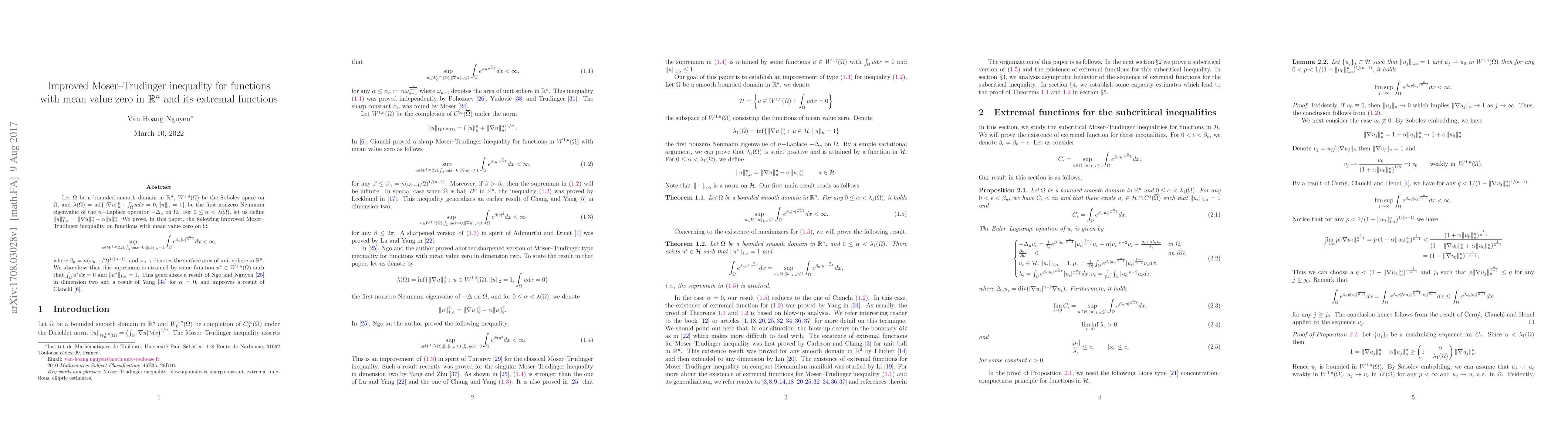 Let $\Omega$ be a bounded smooth domain in $\mathbb R^n$, $W^{1,n}(\Omega)$ be the Sobolev space on $\Omega$, and $\lambda(\Omega) = \inf\{\|\nabla u\|_n^n: \int_\Omega u dx =0, \|u\|_n =1\}$ be the first nonzero Neumann eigenvalue of the $n-$Laplace operator $-\Delta_n$ on $\Omega$. For $0 \leq \alpha < \lambda(\Omega)$, let us define $\|u\|_{1,\alpha}^n =\|\nabla u\|_n^n -\alpha \|u\|_n^n$. We prove, in this paper, the following improved Moser--Trudinger inequality on functions with mean value zero on $\Omega$, \[ \sup_{u\in W^{1,n}(\Omega), \int_\Omega u dx =0, \|u\|_{1,\alpha} =1} \int_{\Omega} e^{\beta_n |u|^{\frac n{n-1}}} dx < \infty, \] where $\beta_n = n (\omega_{n-1}/2)^{1/(n-1)}$, and $\omega_{n-1}$ denotes the surface area of unit sphere in $\mathbb R^n$. We also show that this supremum is attained by some function $u^*\in W^{1,n}(\Omega)$ such that $\int_\Omega u^* dx =0$ and $\|u^*\|_{1,\alpha} =1$. This generalizes a result of Ngo and Nguyen \cite{NN17} in dimension two and a result of Yang \cite{Yang07} for $\alpha=0$, and improves a result of Cianchi \cite{Cianchi05}.