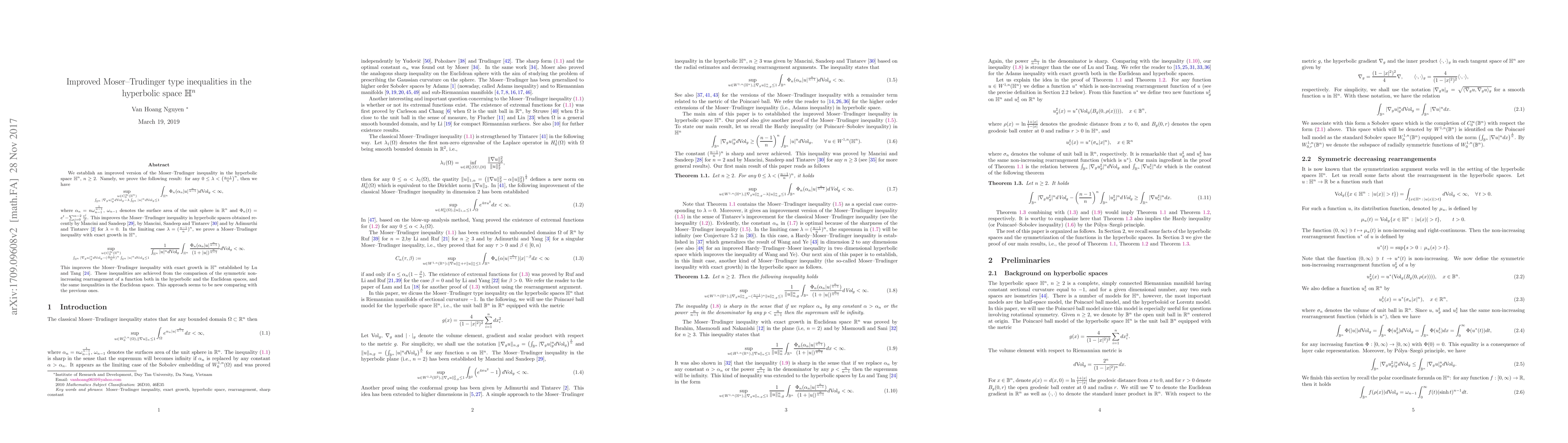 We establish an improved version of the Moser-Trudinger inequality in the hyperbolic space $\mathbb H^n$, $n\geq 2$. Namely, we prove the following result: for any $0 \leq \lambda < \left(\frac{n-1}n\right)^n$, then we have $$ \sup_{\substack{u\in C_0^\infty(\mathbb H^n) \int_{\mathbb H^n} |\nabla_g u|_g^n d\text{Vol}_g -\lambda \int_{\mathbb H^n} |u|^n d\text{ Vol}_g \leq 1}} \int_{\mathbb H^n} \Phi_n(\alpha_n |u|^{\frac{n}{n-1}}) d\text{ Vol}_g < \infty, $$ where $\alpha_n = n \omega_{n-1}^{\frac1{n-1}}$, $\omega_{n-1}$ denotes the surface area of the unit sphere in $\mathbb R^n$ and $\Phi_n(t) = e^t -\sum_{j=0}^{n-2}\frac{t^j}{j!}$. This improves the Moser-Trudinger inequality in hyperbolic spaces obtained recently by Mancini and Sandeep, by Mancini, Sandeep and Tintarev and by Adimurthi and Tintarev. In the limiting case $\lambda =(\frac{n-1}n)^n$, we prove a Moser-Trudinger inequality with exact growth in $\mathbb H^n$, $$ \sup_{\substack{u\in C_0^\infty(\mathbb H^n) \int_{\mathbb H^n} |\nabla_g u|_g^n d\text{ Vol}_g -(\frac{n-1}n)^n \int_{\mathbb H^n} |u|^n d\text{ Vol}_g \leq 1}} \frac{1}{\int_{\mathbb H^n} |u|^n d\text{ Vol}_g}\int_{\mathbb H^n} \frac{\Phi_n(\alpha_n |u|^{\frac{n}{n-1}})}{(1+ |u|)^{\frac n{n-1}}} d\text{ Vol}_g < \infty. $$ This improves the Moser-Trudinger inequality with exact growth in $\mathbb H^n$ established by Lu and Tang.