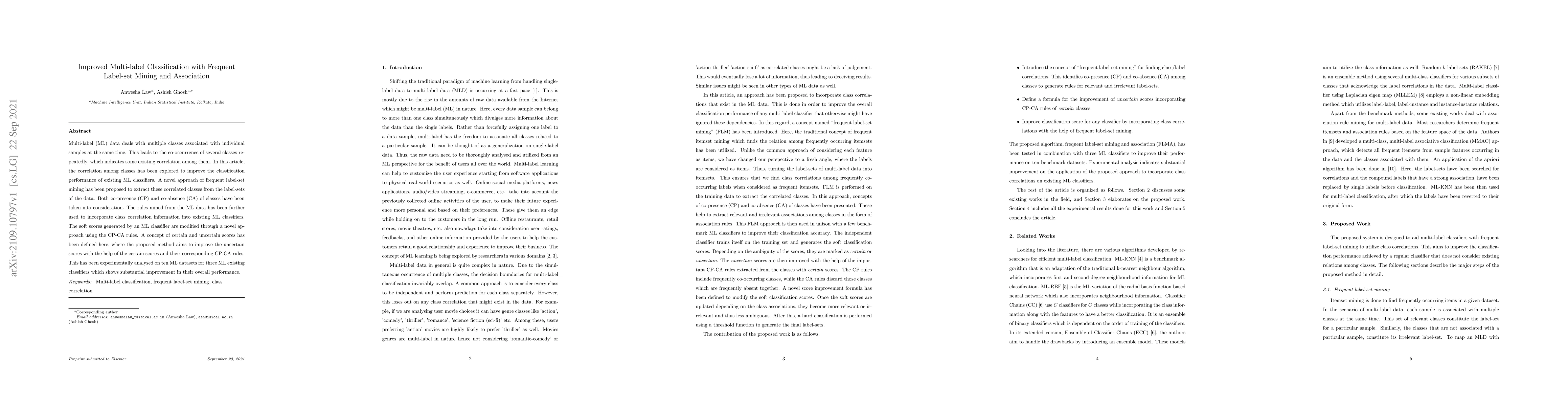 Multi-label (ML) data deals with multiple classes associated with individual samples at the same time. This leads to the co-occurrence of several classes repeatedly, which indicates some existing correlation among them. In this article, the correlation among classes has been explored to improve the classification performance of existing ML classifiers. A novel approach of frequent label-set mining has been proposed to extract these correlated classes from the label-sets of the data. Both co-presence (CP) and co-absence (CA) of classes have been taken into consideration. The rules mined from the ML data has been further used to incorporate class correlation information into existing ML classifiers. The soft scores generated by an ML classifier are modified through a novel approach using the CP-CA rules. A concept of certain and uncertain scores has been defined here, where the proposed method aims to improve the uncertain scores with the help of the certain scores and their corresponding CP-CA rules. This has been experimentally analysed on ten ML datasets for three ML existing classifiers which shows substantial improvement in their overall performance.