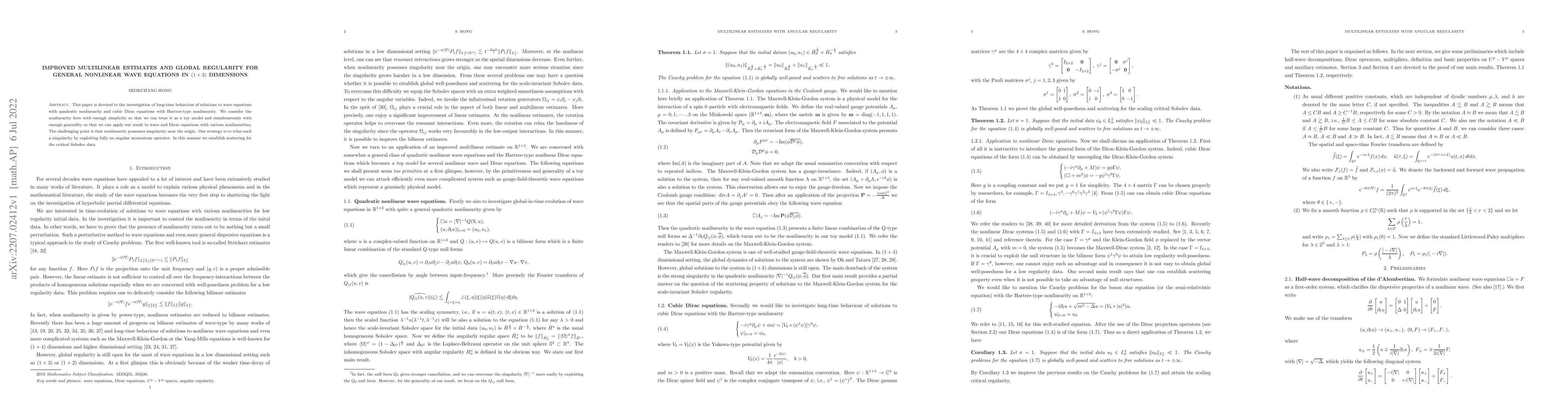 This paper investigates the long-term behavior of solutions to nonlinear wave equations with quadratic and cubic Dirac nonlinearities, establishing scattering for critical Sobolev data by relaxing singularities using an angular momentum operator. The approach is general enough to apply to various nonlinear wave and Dirac equations.