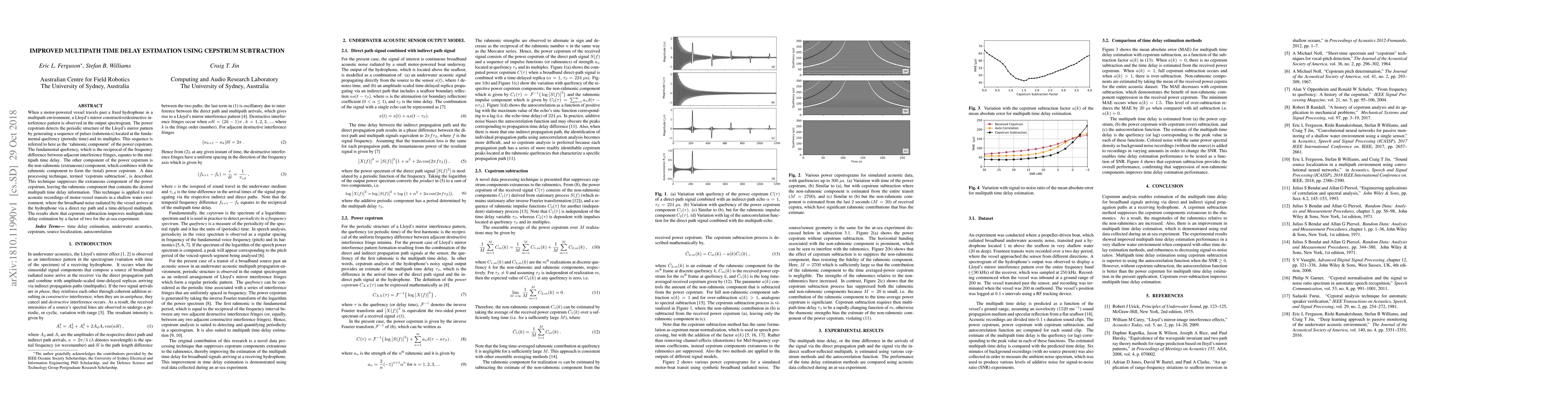 When a motor-powered vessel travels past a fixed hydrophone in a multipath environment, a Lloyd's mirror constructive/destructive interference pattern is observed in the output spectrogram. The power cepstrum detects the periodic structure of the Lloyd's mirror pattern by generating a sequence of pulses (rahmonics) located at the fundamental quefrency (periodic time) and its multiples. This sequence is referred to here as the `rahmonic component' of the power cepstrum. The fundamental quefrency, which is the reciprocal of the frequency difference between adjacent interference fringes, equates to the multipath time delay. The other component of the power cepstrum is the non-rahmonic (extraneous) component, which combines with the rahmonic component to form the (total) power cepstrum. A data processing technique, termed `cepstrum subtraction', is described. This technique suppresses the extraneous component of the power cepstrum, leaving the rahmonic component that contains the desired multipath time delay information. This technique is applied to real acoustic recordings of motor-vessel transits in a shallow water environment, where the broadband noise radiated by the vessel arrives at the hydrophone via a direct ray path and a time-delayed multipath. The results show that cepstrum subtraction improves multipath time delay estimation by a factor of two for the at-sea experiment. keywords - time delay estimation, underwater acoustics, cepstrum, source localization, autocorrelation