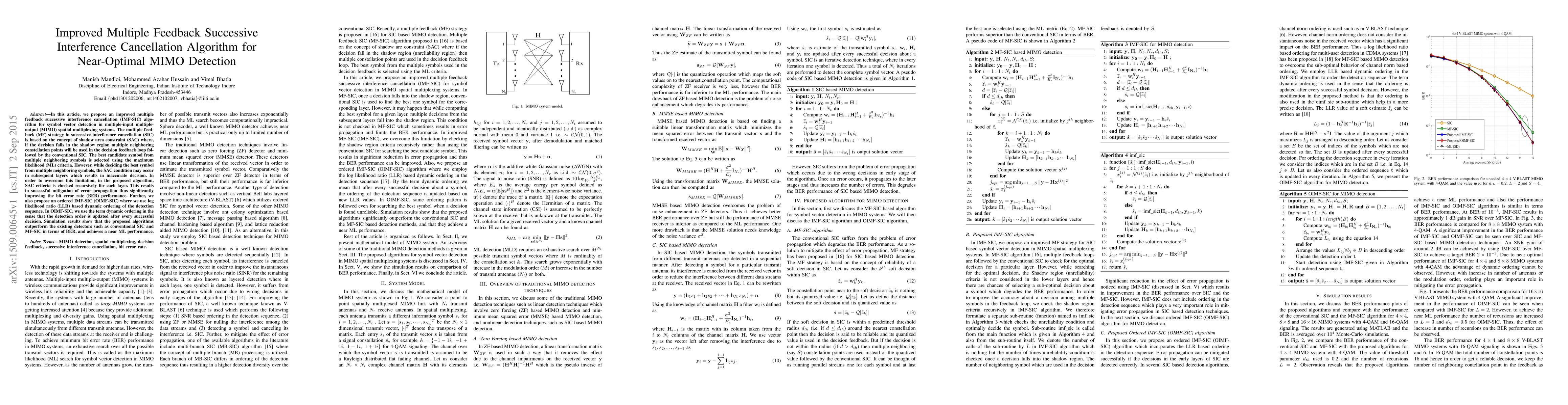 This paper proposes an improved multiple feedback successive interference cancellation (IMF-SIC) algorithm for MIMO detection, utilizing a shadow area constraint (SAC) to mitigate error propagation and enhance bit error rate (BER) performance. An ordered IMF-SIC (OIMF-SIC) variant further optimizes detection sequence ordering dynamically, achieving near maximum likelihood performance.