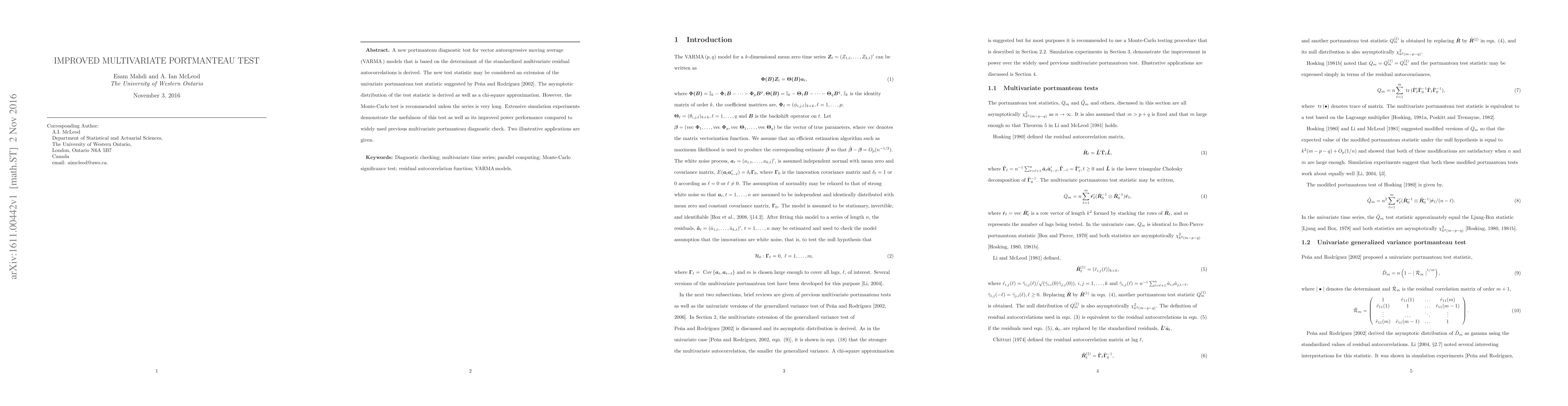 This paper introduces a new multivariate portmanteau test for VARMA models based on the determinant of standardized residual autocorrelations, extending the univariate test by Pena and Rodriguez. The test shows improved power performance over existing methods, with extensive simulations validating its effectiveness.