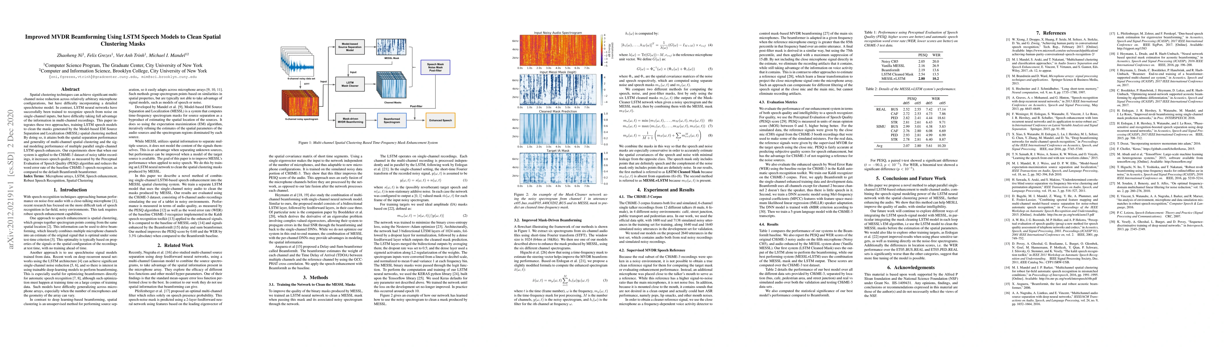 Spatial clustering techniques can achieve significant multi-channel noise reduction across relatively arbitrary microphone configurations, but have difficulty incorporating a detailed speech/noise model. In contrast, LSTM neural networks have successfully been trained to recognize speech from noise on single-channel inputs, but have difficulty taking full advantage of the information in multi-channel recordings. This paper integrates these two approaches, training LSTM speech models to clean the masks generated by the Model-based EM Source Separation and Localization (MESSL) spatial clustering method. By doing so, it attains both the spatial separation performance and generality of multi-channel spatial clustering and the signal modeling performance of multiple parallel single-channel LSTM speech enhancers. Our experiments show that when our system is applied to the CHiME-3 dataset of noisy tablet recordings, it increases speech quality as measured by the Perceptual Evaluation of Speech Quality (PESQ) algorithm and reduces the word error rate of the baseline CHiME-3 speech recognizer, as compared to the default BeamformIt beamformer.