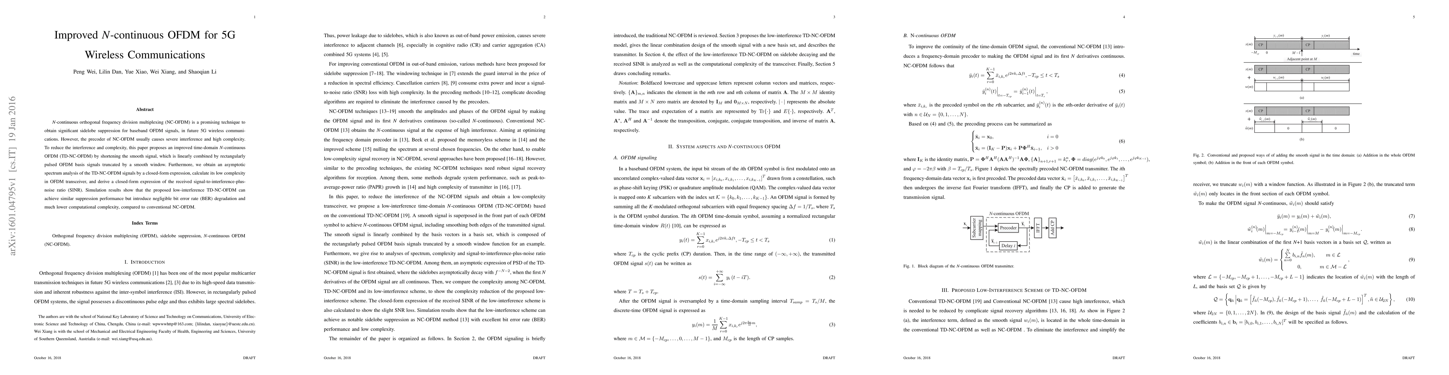 The paper proposes an improved time-domain N-continuous OFDM (TD-NC-OFDM) for 5G wireless communications, reducing interference and complexity by shortening the smooth signal, which is a linear combination of rectangularly pulsed OFDM basis signals truncated by a smooth window.