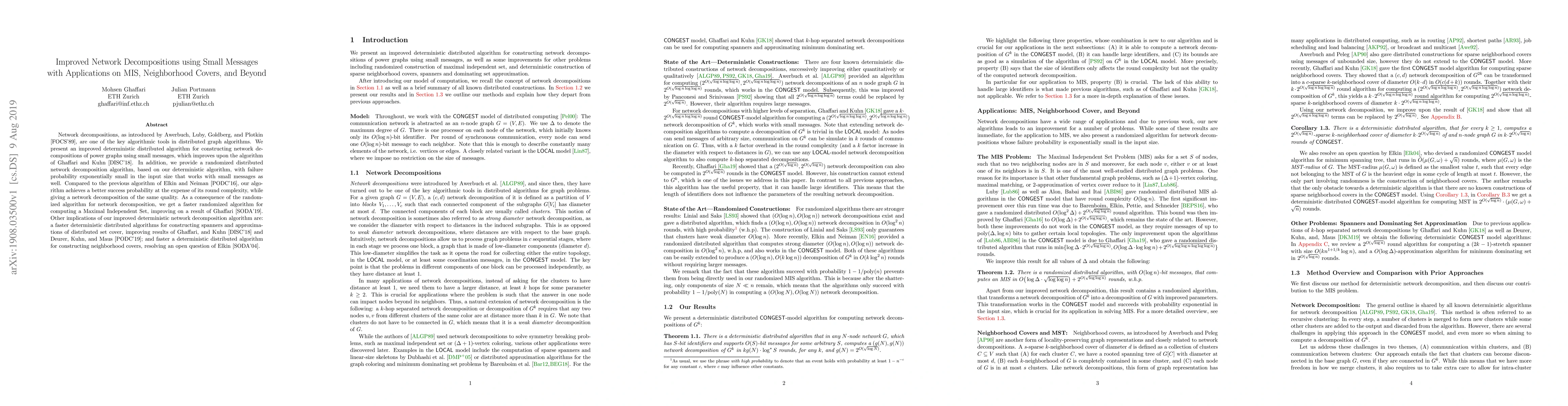 This paper presents improved deterministic and randomized distributed algorithms for constructing network decompositions using small messages, achieving better success probabilities and faster runtimes. The improvements lead to faster algorithms for computing Maximal Independent Sets, spanners, distributed set cover approximations, and neighborhood covers.