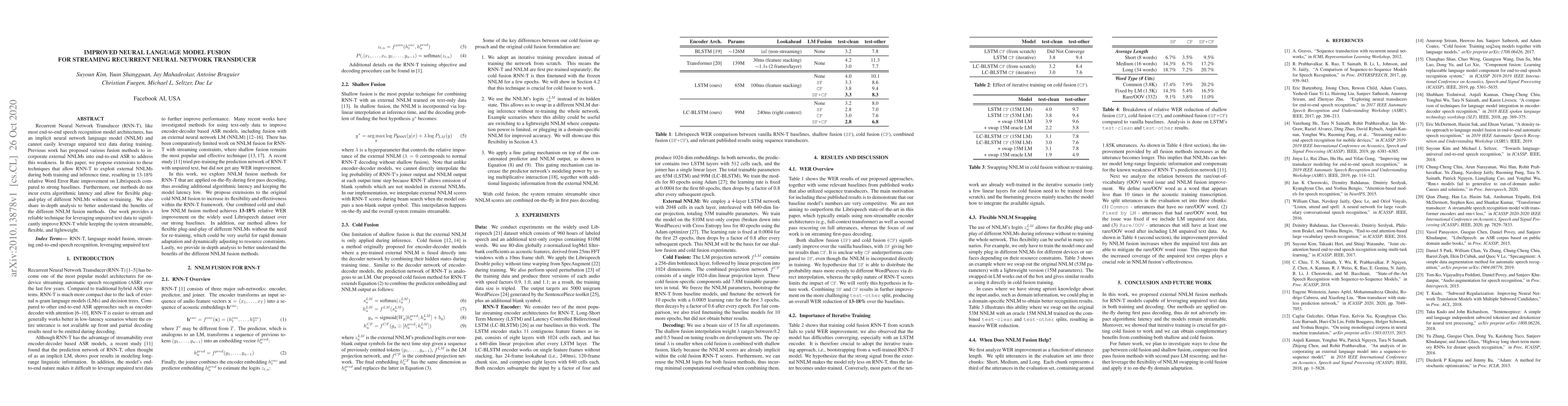 This paper proposes enhanced neural network language model fusion techniques for Recurrent Neural Network Transducer (RNN-T) models, achieving 13-18% relative Word Error Rate improvement on Librispeech. The methods allow for external NNLM integration during both training and inference without extra latency, maintaining flexibility and system efficiency.