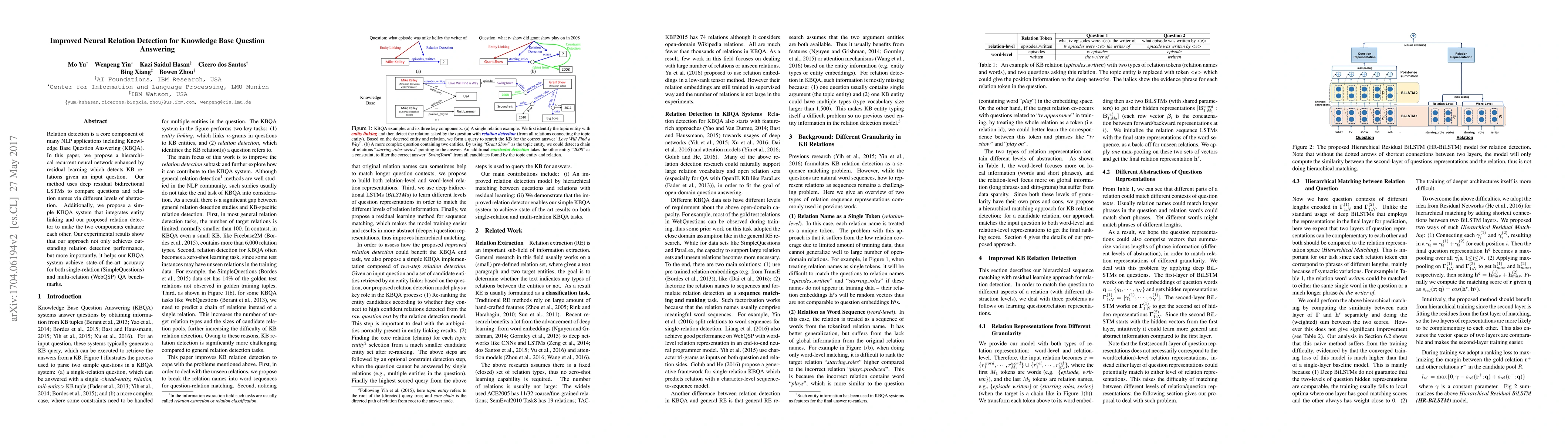 This paper proposes a hierarchical recurrent neural network with residual learning for improved relation detection in Knowledge Base Question Answering (KBQA). The method uses deep residual bidirectional LSTMs to compare questions and relation names across different abstraction levels, achieving state-of-the-art accuracy on single- and multi-relation QA benchmarks.