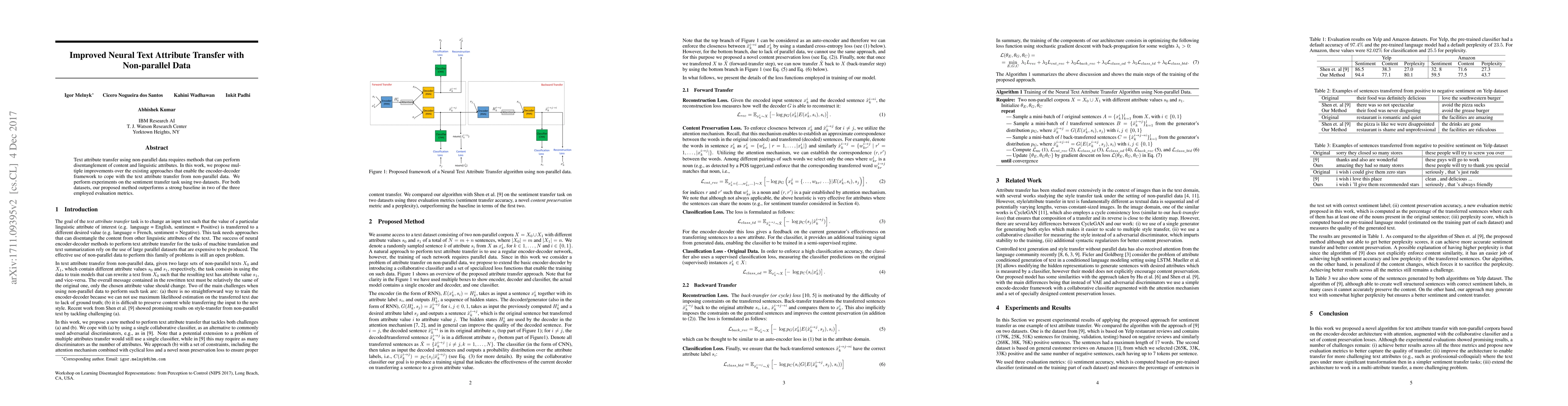 This paper proposes enhancements to an encoder-decoder framework for text attribute transfer from non-parallel data, achieving better disentanglement of content and linguistic attributes. Experiments show improved performance on sentiment transfer tasks compared to a strong baseline.