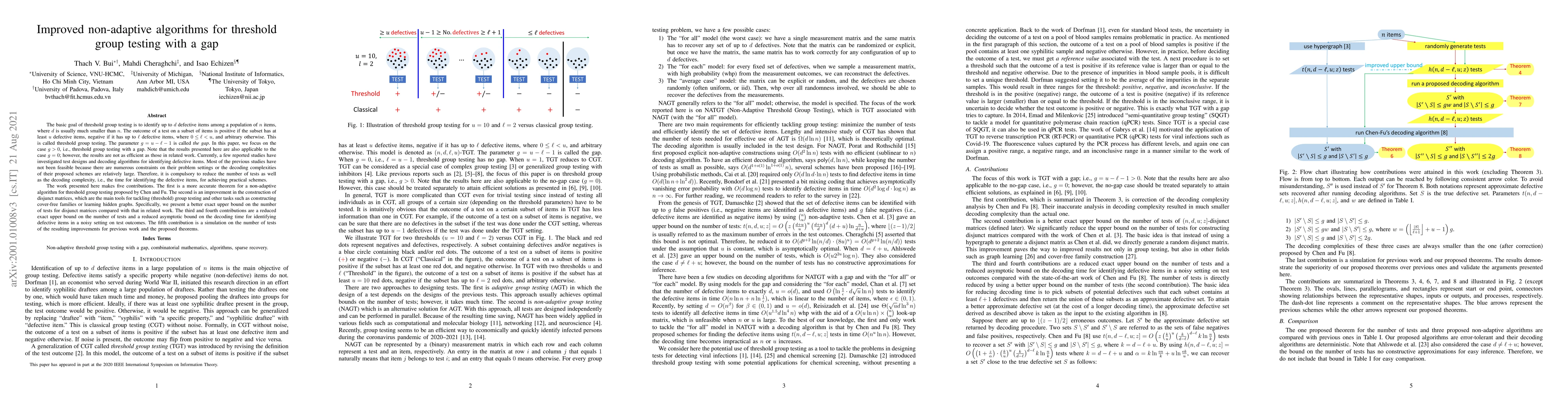 This paper presents improved non-adaptive algorithms for threshold group testing with a gap, focusing on reducing the number of tests and decoding complexity. Key contributions include a refined theorem for a non-adaptive algorithm, enhanced construction of disjunct matrices, and reduced upper bounds on tests and decoding time.