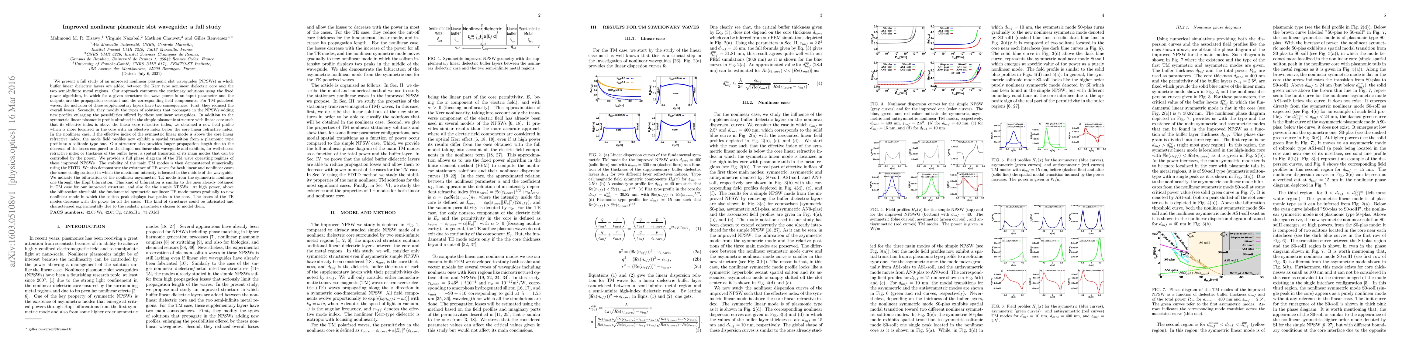 This paper studies an improved nonlinear plasmonic slot waveguide with added buffer layers, showing reduced losses and enhanced propagation modes. The structure exhibits longer propagation length and controllable spatial transitions, with numerical stability demonstrated and potential for experimental realization.