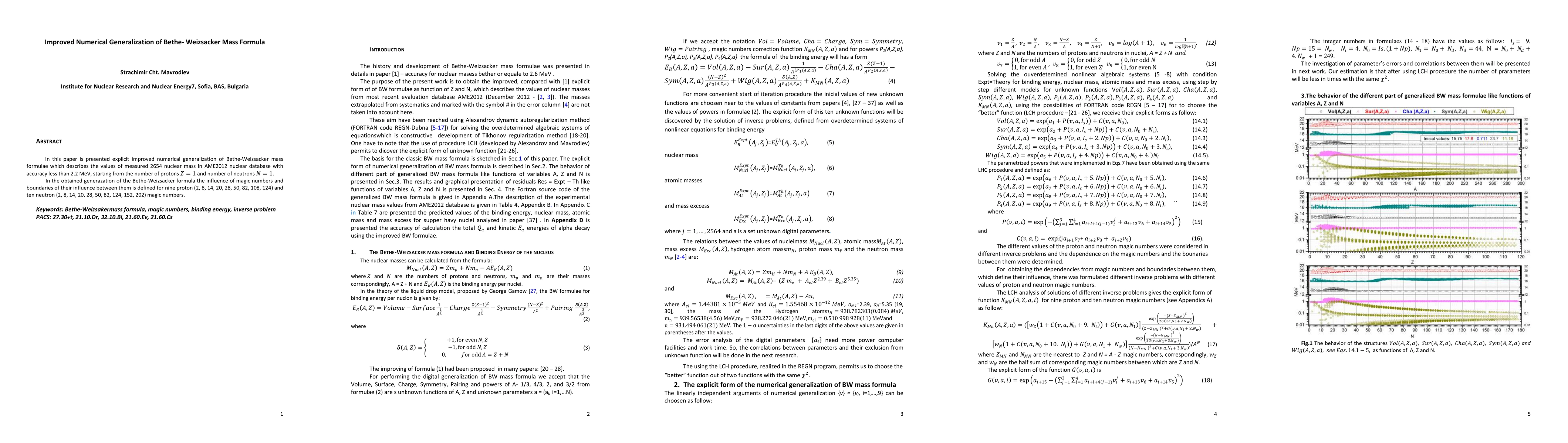 This paper introduces an improved numerical generalization of the Bethe-Weizsacker mass formula, achieving an accuracy of less than 2.2 MeV for 2654 nuclear masses, and defines the influence of magic numbers for both protons and neutrons.