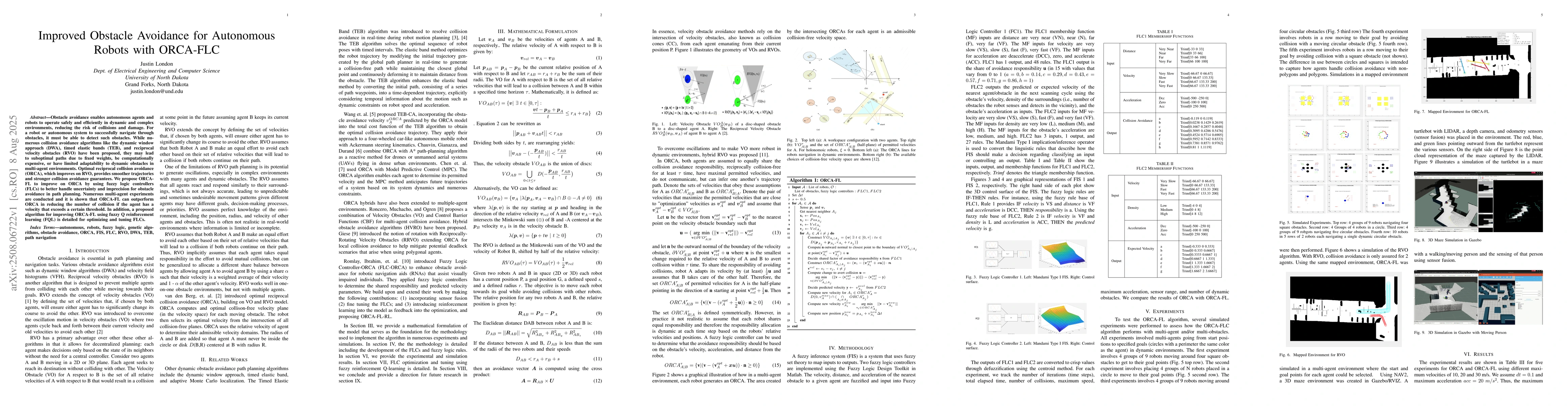 Obstacle avoidance enables autonomous agents and robots to operate safely and efficiently in dynamic and complex environments, reducing the risk of collisions and damage. For a robot or autonomous system to successfully navigate through obstacles, it must be able to detect such obstacles. While numerous collision avoidance algorithms like the dynamic window approach (DWA), timed elastic bands (TEB), and reciprocal velocity obstacles (RVO) have been proposed, they may lead to suboptimal paths due to fixed weights, be computationally expensive, or have limited adaptability to dynamic obstacles in multi-agent environments. Optimal reciprocal collision avoidance (ORCA), which improves on RVO, provides smoother trajectories and stronger collision avoidance guarantees. We propose ORCA-FL to improve on ORCA by using fuzzy logic controllers (FLCs) to better handle uncertainty and imprecision for obstacle avoidance in path planning. Numerous multi-agent experiments are conducted and it is shown that ORCA-FL can outperform ORCA in reducing the number of collision if the agent has a velocity that exceeds a certain threshold. In addition, a proposed algorithm for improving ORCA-FL using fuzzy Q reinforcement learning (FQL) is detailed for optimizing and tuning FLCs.