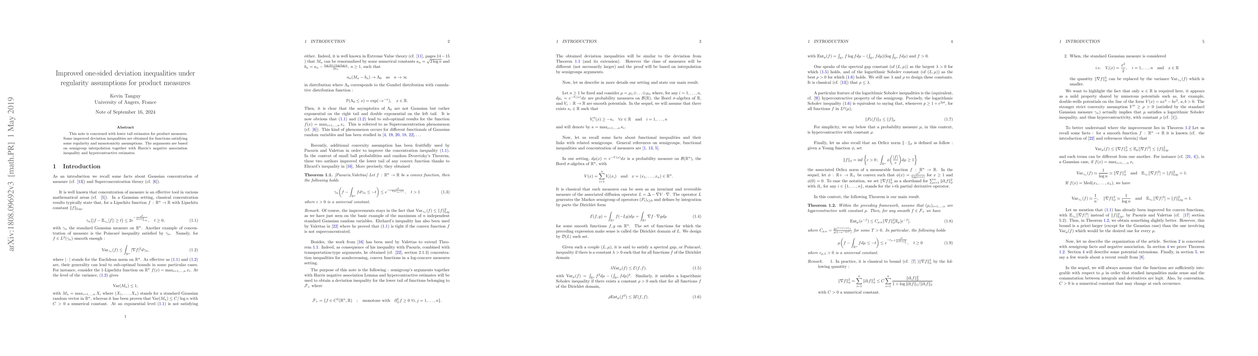 This note is concerned with lower tail estimates for product measures. Some improved deviation inequalities are obtained for functions satisfying some regularity and monotonicity assumptions. The arguments are based on semigroup interpolation together with Harris's negative association inequality and hypercontractive estimates.