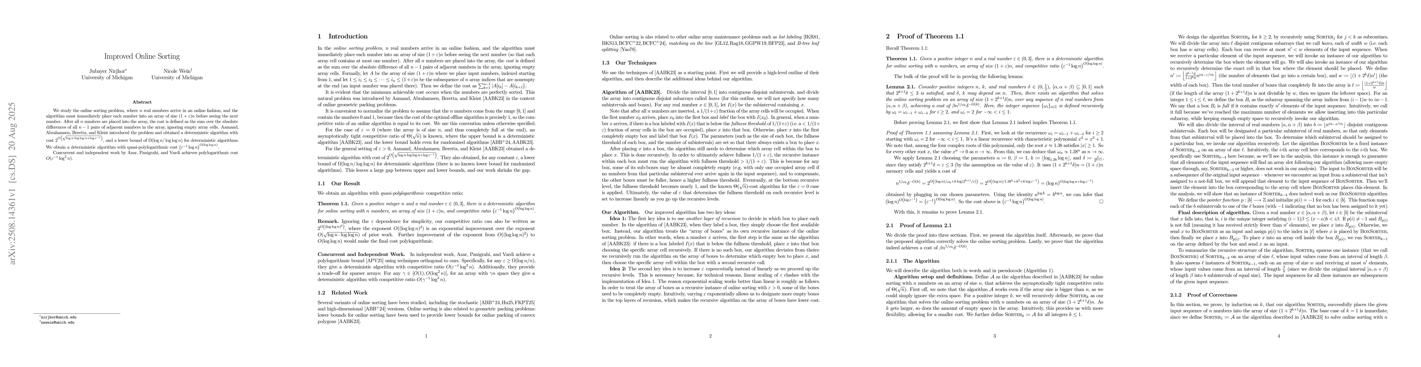 The research presents a deterministic algorithm for the online sorting problem, improving upon previous work by Aamand et al. and Azar et al. The algorithm operates on an array of size (1+ε)n and aims to minimize the cost defined as the sum of absolute differences between adjacent elements after all n numbers are placed.