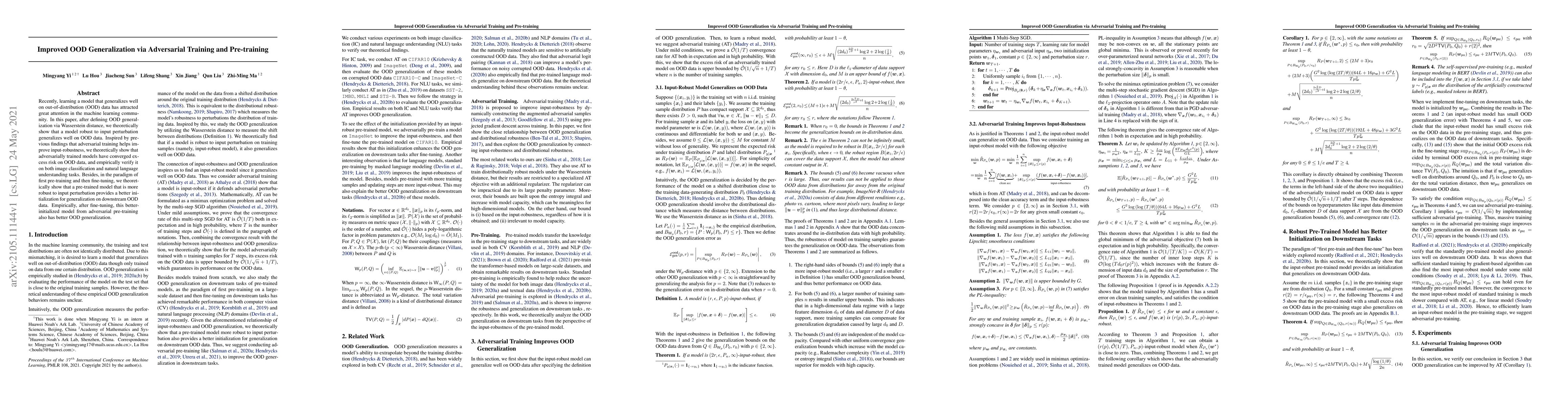 This paper explores enhancing out-of-distribution (OOD) generalization through adversarial training and pre-training. It theoretically demonstrates that adversarial training improves input-robustness and OOD performance, and empirically verifies this across image classification and natural language tasks. It also shows that pre-trained models with higher input robustness offer superior initialization for downstream OOD tasks, which is confirmed through fine-tuning experiments.
