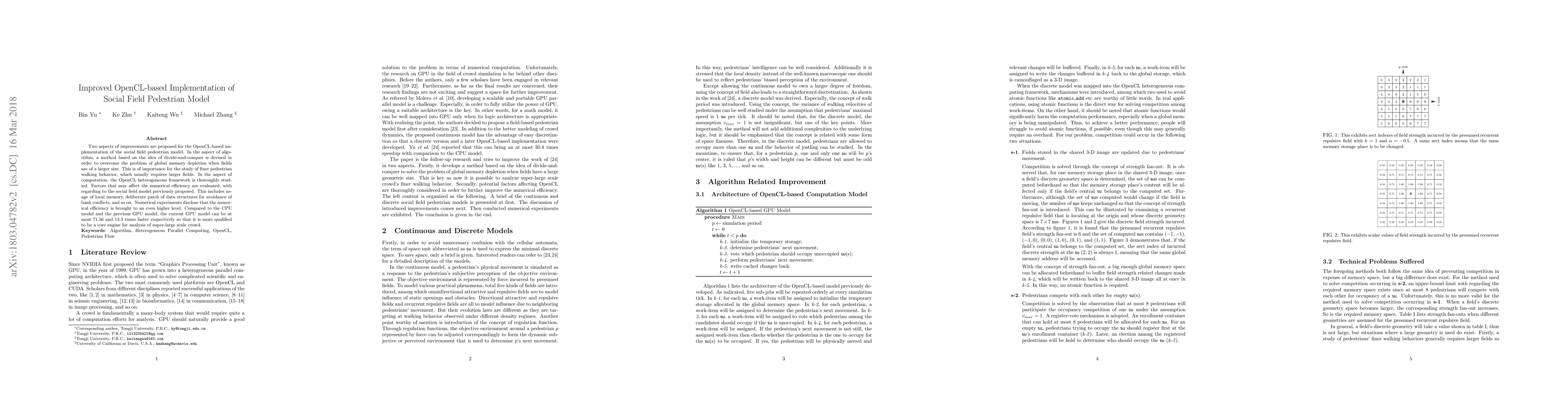 This paper proposes algorithmic and computational improvements for an OpenCL-based implementation of the social field pedestrian model, achieving up to 71.56 times faster performance compared to the CPU model and 13.3 times faster than the previous GPU model. The enhancements include a divide-and-conquer method to manage large fields and optimizations within the OpenCL framework.