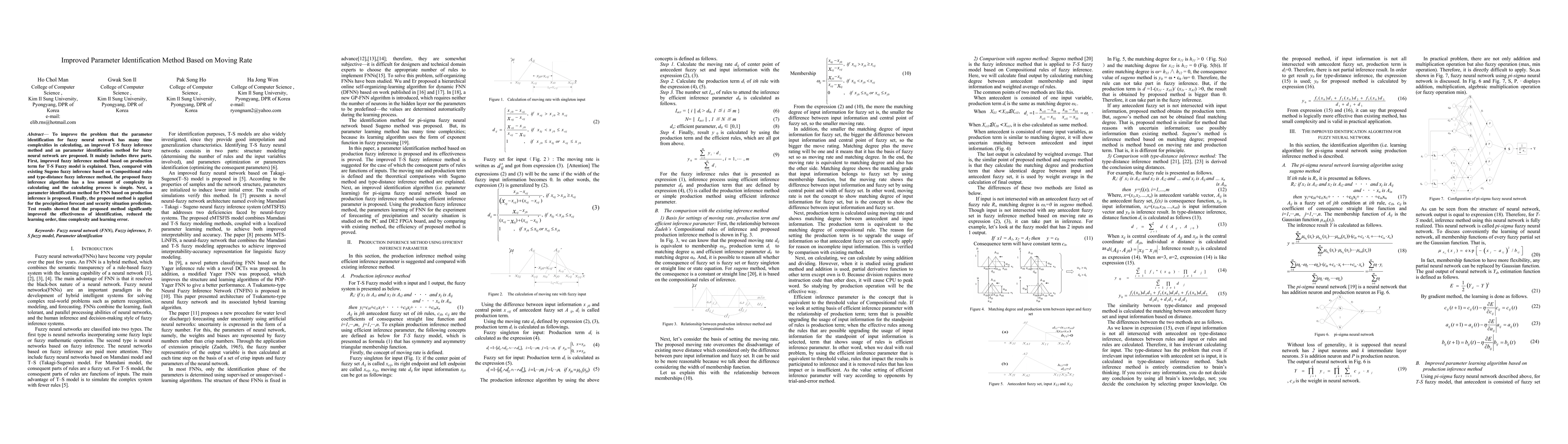 To improve the problem that the parameter identification for fuzzy neural network has many time complexities in calculating, an improved T-S fuzzy inference method and an parameter identification method for fuzzy neural network are proposed. It mainly includes three parts. First, improved fuzzy inference method based on production term for T-S Fuzzy model is explained. Then, compared with existing Sugeno fuzzy inference based on Compositional rules and type-distance fuzzy inference method, the proposed fuzzy inference algorithm has a less amount of complexity in calculating and the calculating process is simple. Next, a parameter identification method for FNN based on production inference is proposed. Finally, the proposed method is applied for the precipitation forecast and security situation prediction. Test results showed that the proposed method significantly improved the effectiveness of identification, reduced the learning order, time complexity and learning error.