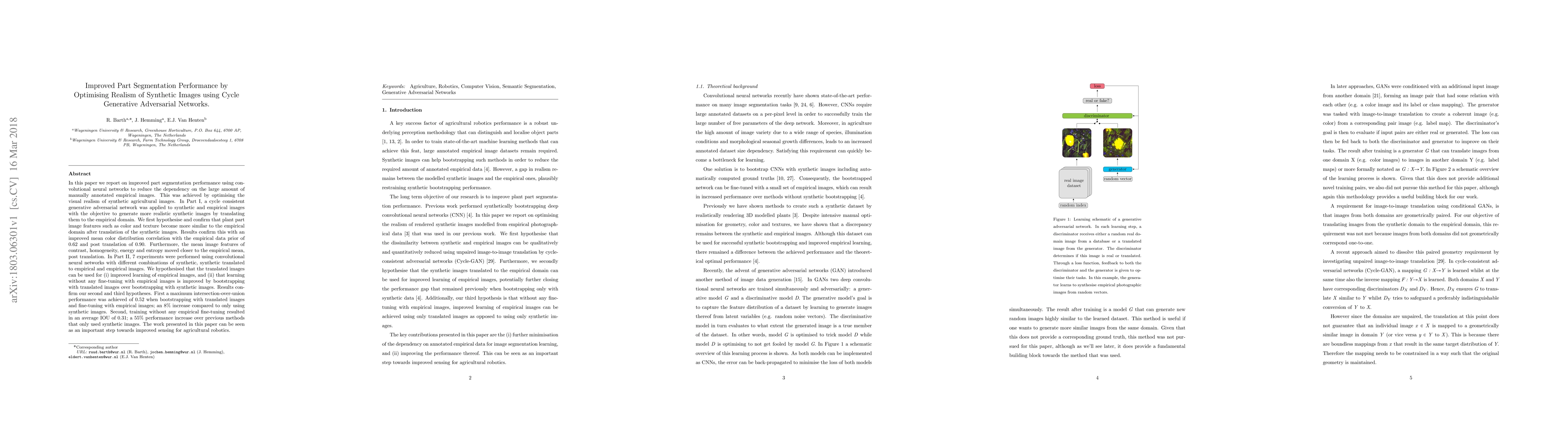 In this paper we report on improved part segmentation performance using convolutional neural networks to reduce the dependency on the large amount of manually annotated empirical images. This was achieved by optimising the visual realism of synthetic agricultural images.In Part I, a cycle consistent generative adversarial network was applied to synthetic and empirical images with the objective to generate more realistic synthetic images by translating them to the empirical domain. We first hypothesise and confirm that plant part image features such as color and texture become more similar to the empirical domain after translation of the synthetic images.Results confirm this with an improved mean color distribution correlation with the empirical data prior of 0.62 and post translation of 0.90. Furthermore, the mean image features of contrast, homogeneity, energy and entropy moved closer to the empirical mean, post translation. In Part II, 7 experiments were performed using convolutional neural networks with different combinations of synthetic, synthetic translated to empirical and empirical images. We hypothesised that the translated images can be used for (i) improved learning of empirical images, and (ii) that learning without any fine-tuning with empirical images is improved by bootstrapping with translated images over bootstrapping with synthetic images. Results confirm our second and third hypotheses. First a maximum intersection-over-union performance was achieved of 0.52 when bootstrapping with translated images and fine-tuning with empirical images; an 8% increase compared to only using synthetic images. Second, training without any empirical fine-tuning resulted in an average IOU of 0.31; a 55% performance increase over previous methods that only used synthetic images.