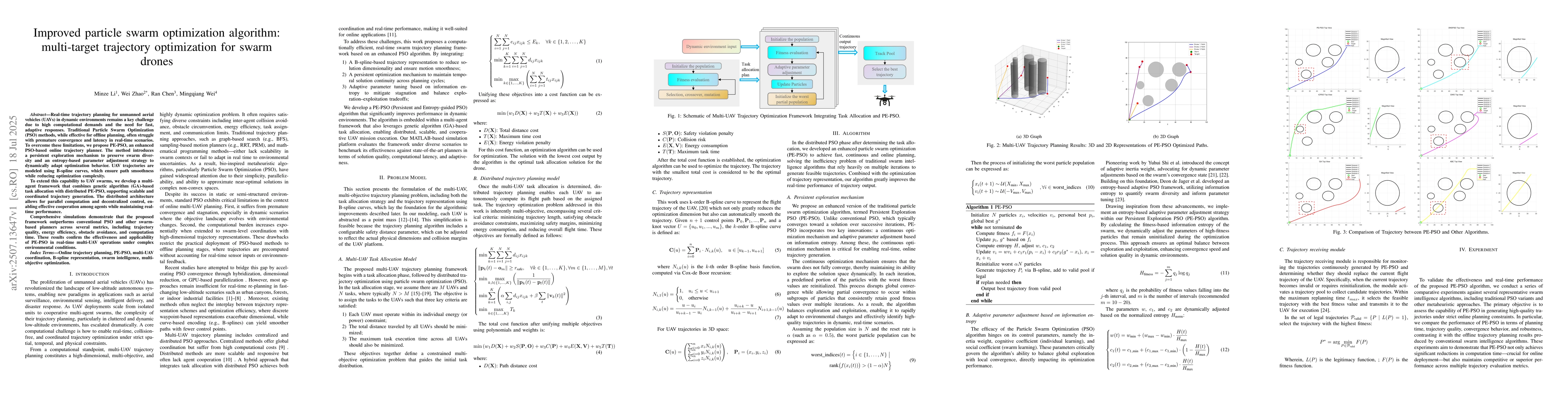 The research introduces PE-PSO, an enhanced Particle Swarm Optimization algorithm for real-time trajectory planning of multiple drones in dynamic environments. PE-PSO maintains swarm diversity with persistent exploration and adapts optimization behavior using entropy-based parameter adjustment. The method uses B-spline curves for smooth trajectories, and combines with a genetic algorithm for task allocation, creating a scalable, decentralized framework. Simulations show PE-PSO outperforms traditional methods in terms of trajectory quality, energy efficiency, obstacle avoidance, and computation time.