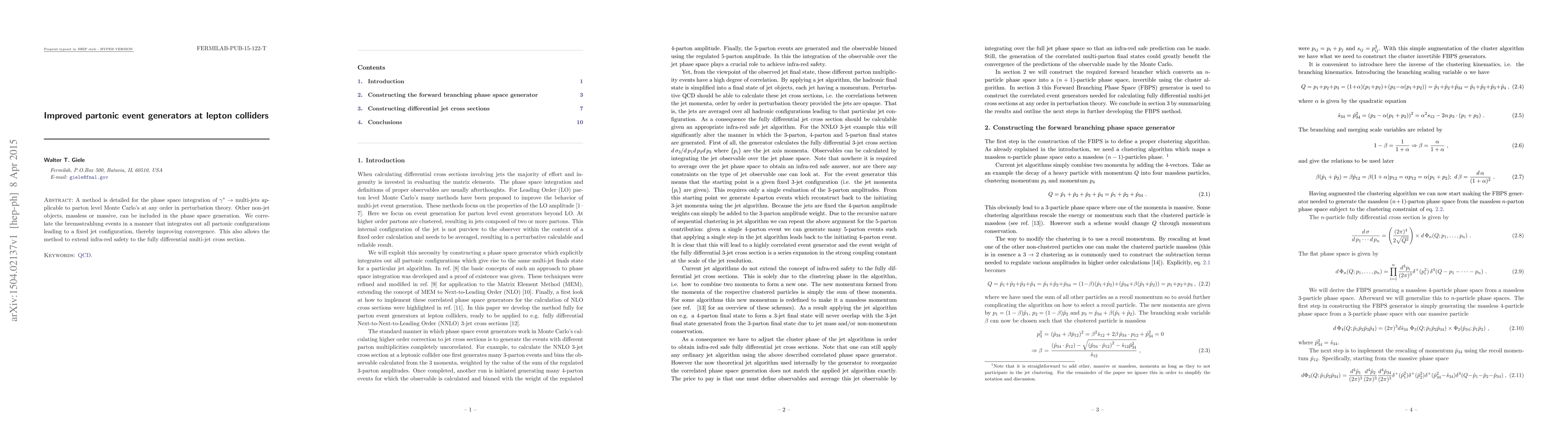 Researchers developed a new method for generating phase space integrals at lepton colliders that improves convergence and extends infrared safety to fully differential multi-jet cross-sections.