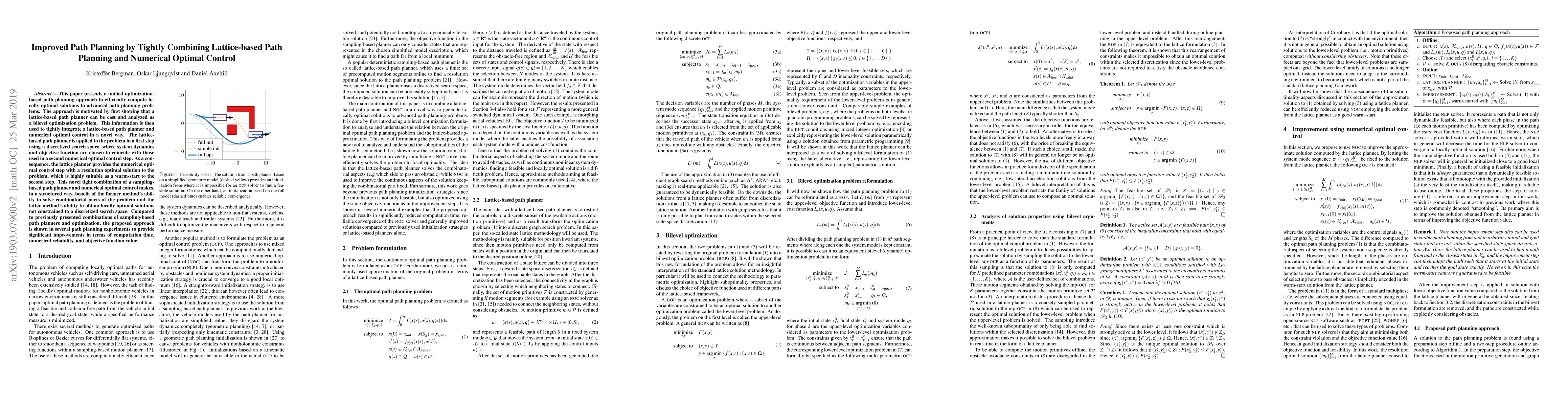This paper presents a unified optimization-based path planning approach to efficiently compute locally optimal solutions to advanced path planning problems. The approach is motivated by first showing that a lattice-based path planner can be cast and analyzed as a bilevel optimization problem. This information is then used to tightly integrate a lattice-based path planner and numerical optimal control in a novel way. The lattice-based path planner is applied to the problem in a first step using a discretized search space, where system dynamics and objective function are chosen to coincide with those used in a second numerical optimal control step. As a consequence, the lattice planner provides the numerical optimal control step with a resolution optimal solution to the problem, which is highly suitable as a warm-start to the second step. This novel tight combination of a sampling-based path planner and numerical optimal control makes, in a structured way, benefit of the former method's ability to solve combinatorial parts of the problem and the latter method's ability to obtain locally optimal solutions not constrained to a discretized search space. Compared to previously presented combinations of sampling-based path planners and optimization, the proposed approach is shown in several path planning experiments to provide significant improvements in terms of computation time, numerical reliability, and objective function value.