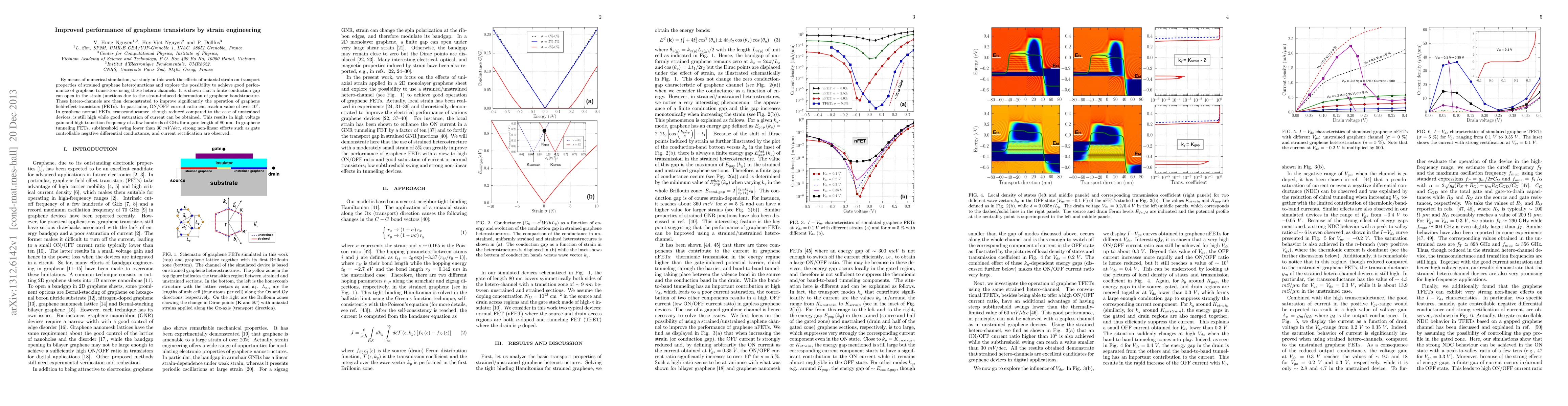 This study demonstrates that uniaxial strain on graphene heterojunctions can significantly enhance the performance of graphene transistors, achieving an ON/OFF current ratio over 10$^5$ and a transition frequency of hundreds of GHz, alongside notable subthreshold swing and non-linear effects in graphene tunneling FETs.