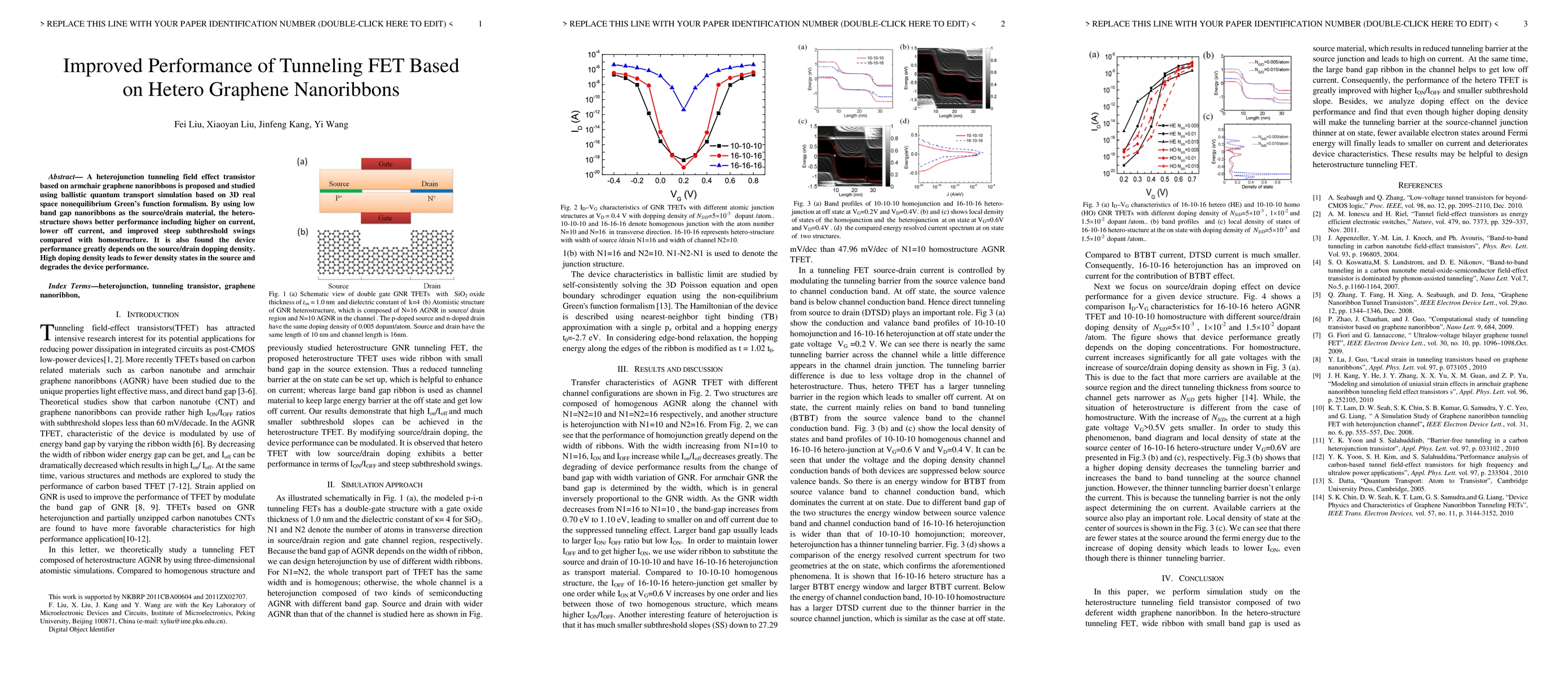 Summary: This paper proposes a heterojunction tunneling FET based on armchair graphene nanoribbons, showing improved performance with higher on current, lower off current, and better subthreshold swings compared to homostructures. Device performance is highly dependent on source/drain doping density, with high doping degrading the device.