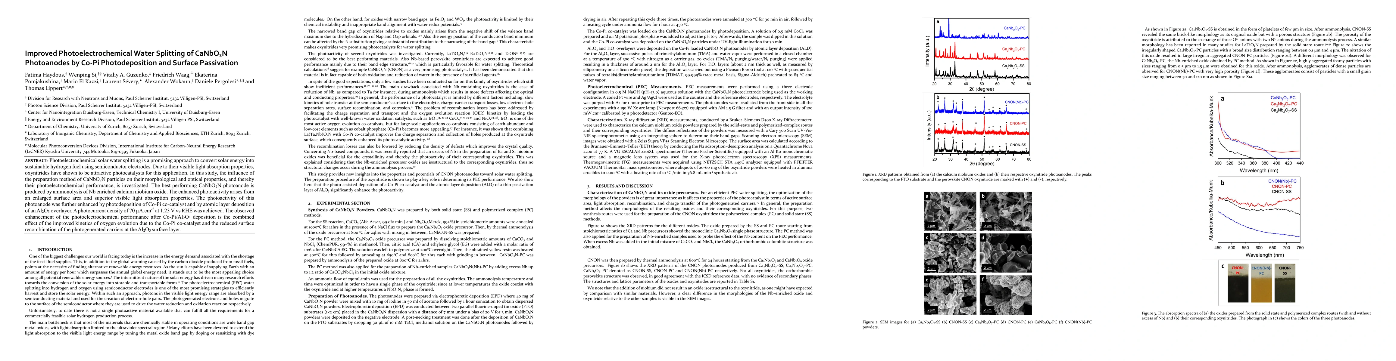This study investigates the photoelectrochemical water splitting performance of CaNbO2N photoanodes, finding that ammonolysis of Nb enriched calcium niobium oxide produces the best results due to enhanced visible light absorption and surface area. Further improvements are achieved through Co-Pi co-catalyst and Al2O3 surface passivation, resulting in a photocurrent density of 70 microA.cm-2 at 1.23 V vs RHE.
