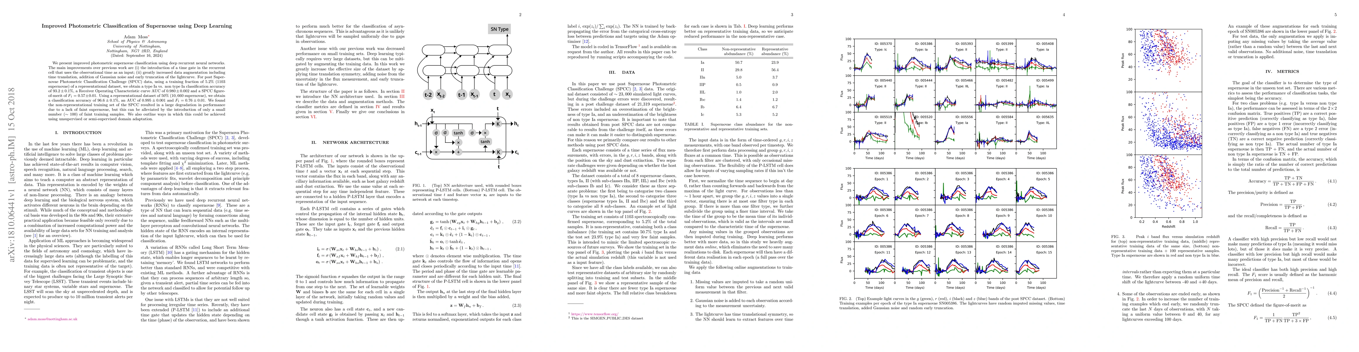 We present improved photometric supernovae classification using deep recurrent neural networks. The main improvements over previous work are (i) the introduction of a time gate in the recurrent cell that uses the observational time as an input; (ii) greatly increased data augmentation including time translation, addition of Gaussian noise and early truncation of the lightcurve. For post Supernovae Photometric Classification Challenge (SPCC) data, using a training fraction of $5.2\%$ (1103 supernovae) of a representational dataset, we obtain a type Ia vs. non type Ia classification accuracy of $93.2 \pm 0.1\%$, a Receiver Operating Characteristic curve AUC of $0.980 \pm 0.002$ and a SPCC figure-of-merit of $F_1=0.57 \pm 0.01$. Using a representational dataset of $50\%$ ($10660$ supernovae), we obtain a classification accuracy of $96.6 \pm 0.1\%$, an AUC of $0.995 \pm 0.001$ and $F_1=0.76 \pm 0.01$. We found the non-representational training set of the SPCC resulted in a large degradation in performance due to a lack of faint supernovae, but this can be migrated by the introduction of only a small number ($\sim 100$) of faint training samples. We also outline ways in which this could be achieved using unsupervised domain adaptation.