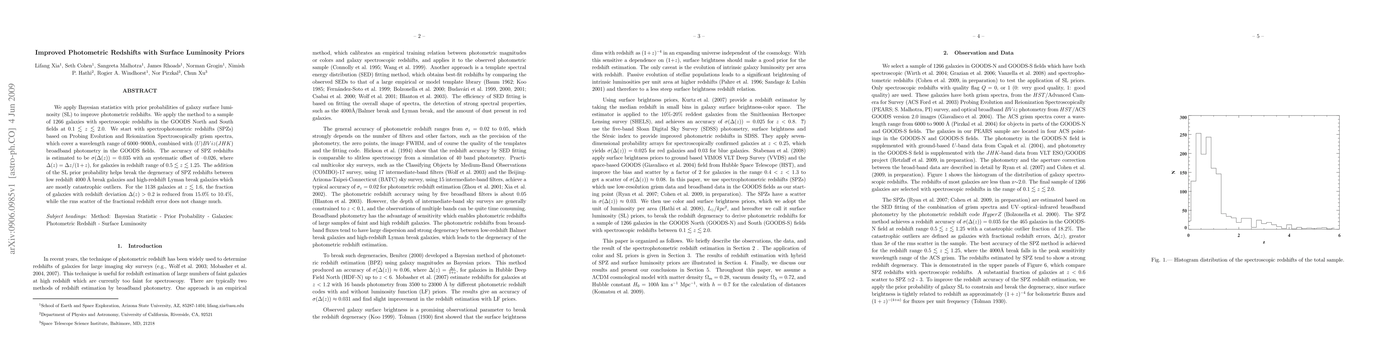 We apply Bayesian statistics with prior probabilities of galaxy surface luminosity (SL) to improve photometric redshifts. We apply the method to a sample of 1266 galaxies with spectroscopic redshifts in the GOODS North and South fields at 0.1 < z < 2.0. We start with spectrophotometric redshifts (SPZs) based on Probing Evolution and Reionization Spectroscopically grism spectra, which cover a wavelength range of 6000-9000A, combined with (U)BViz(JHK) broadband photometry in the GOODS fields. The accuracy of SPZ redshifts is estimated to be \sigma (\Delta(z))=0.035 with an systematic offset of -0.026, where \Delta(z)=\Delta z / (1+z), for galaxies in redshift range of 0.5 < z < 1.25. The addition of the SL prior probability helps break the degeneracy of SPZ redshifts between low redshift 4000 A break galaxies and high-redshift Lyman break galaxies which are mostly catastrophic outliers. For the 1138 galaxies at z < 1.6, the fraction of galaxies with redshift deviation \Delta (z) > 0.2 is reduced from 15.0% to 10.4%, while the rms scatter of the fractional redshift error does not change much.