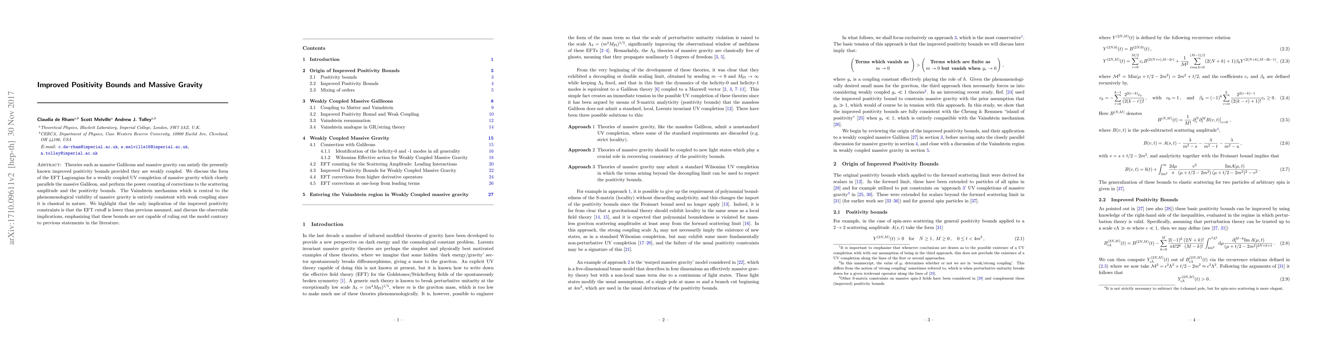 Theories such as massive Galileons and massive gravity can satisfy the presently known improved positivity bounds provided they are weakly coupled. We discuss the form of the EFT Lagrangian for a weakly coupled UV completion of massive gravity which closely parallels the massive Galileon, and perform the power counting of corrections to the scattering amplitude and the positivity bounds. The Vainshtein mechanism which is central to the phenomenological viability of massive gravity is entirely consistent with weak coupling since it is classical in nature. We highlight that the only implication of the improved positivity constraints is that EFT cutoff is lower than previous assumed, and discuss the observable implications, emphasizing that these bounds are not capable of ruling out the model contrary to previous statements in the literature.