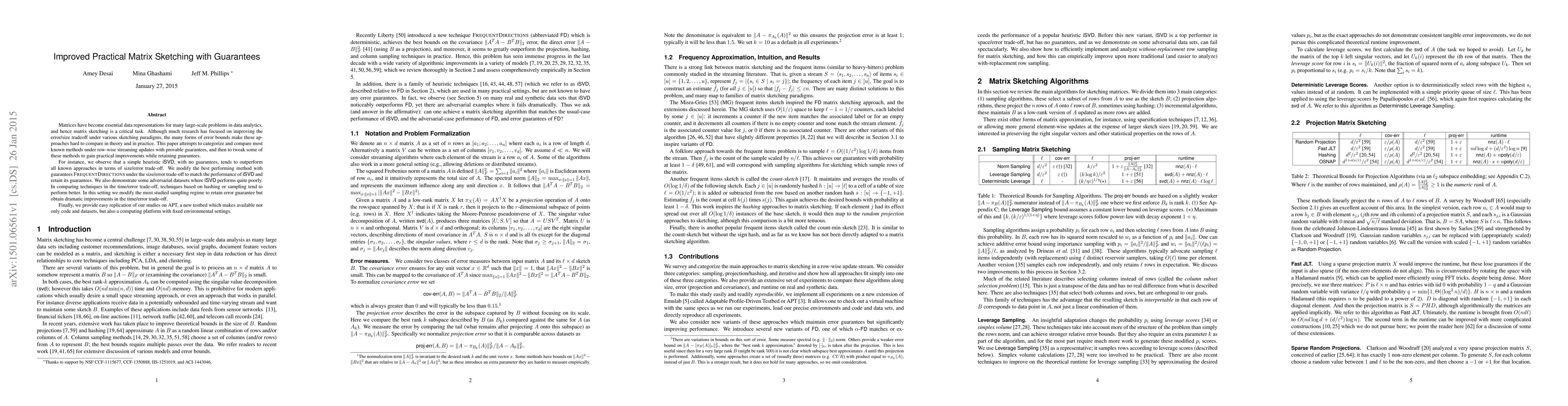 A new approach to matrix sketching improves error/size trade-off and time/error trade-off without sacrificing guarantees, outperforming existing methods in certain scenarios.