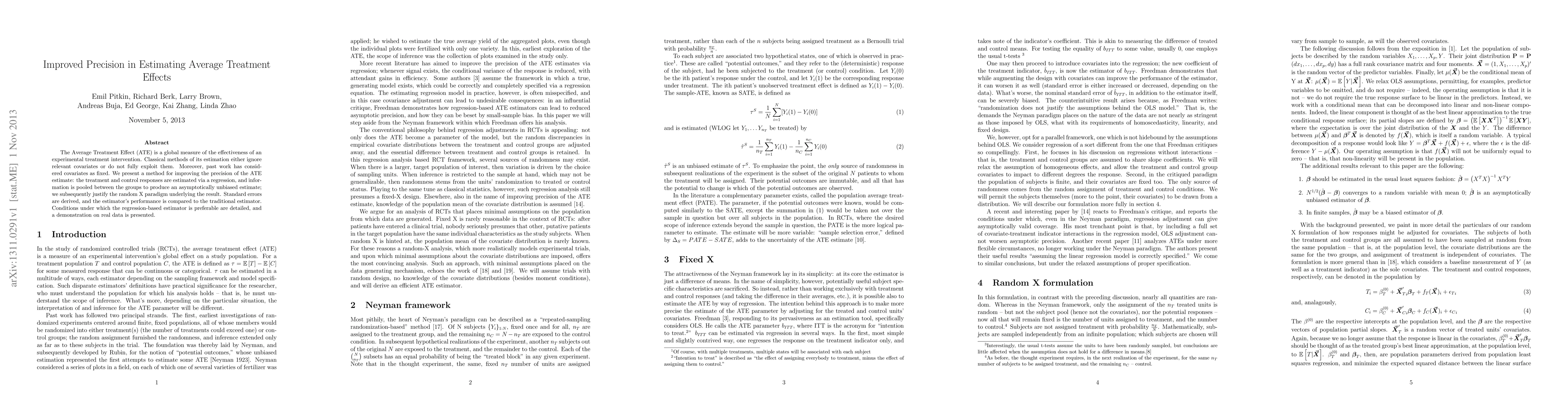 The Average Treatment Effect (ATE) is a global measure of the effectiveness of an experimental treatment intervention. Classical methods of its estimation either ignore relevant covariates or do not fully exploit them. Moreover, past work has considered covariates as fixed. We present a method for improving the precision of the ATE estimate: the treatment and control responses are estimated via a regression, and information is pooled between the groups to produce an asymptotically unbiased estimate; we subsequently justify the random X paradigm underlying the result. Standard errors are derived, and the estimator's performance is compared to the traditional estimator. Conditions under which the regression-based estimator is preferable are detailed, and a demonstration on real data is presented.